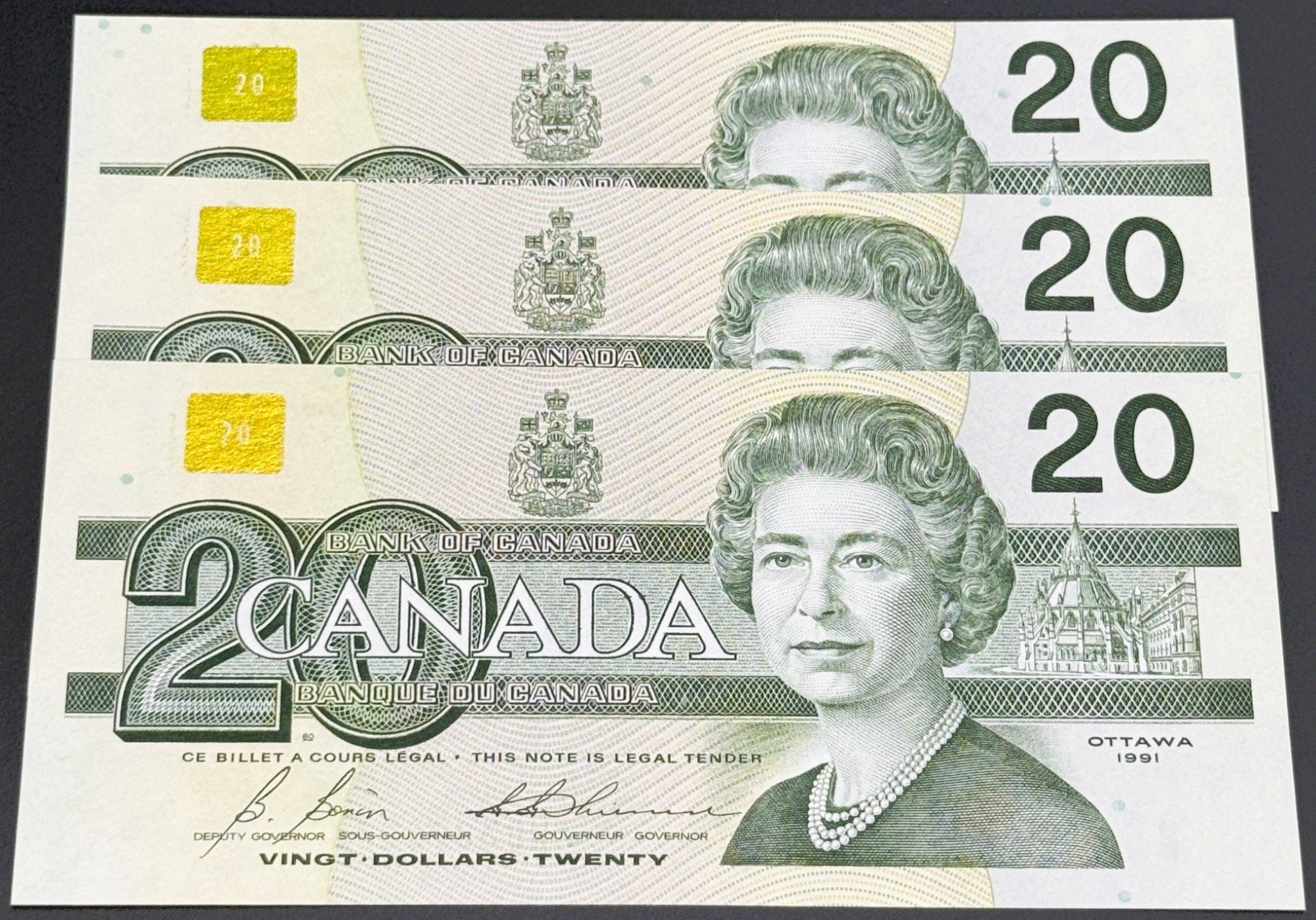 Banque du Canada – 20 Dollars 1991 – 3 Consécutifs – Bonin/Thiessen – Préfixe AWB – UNC