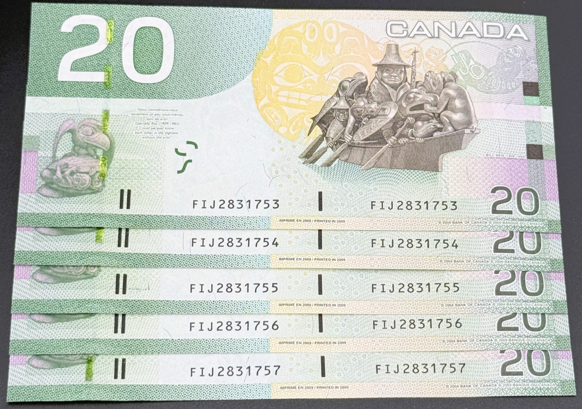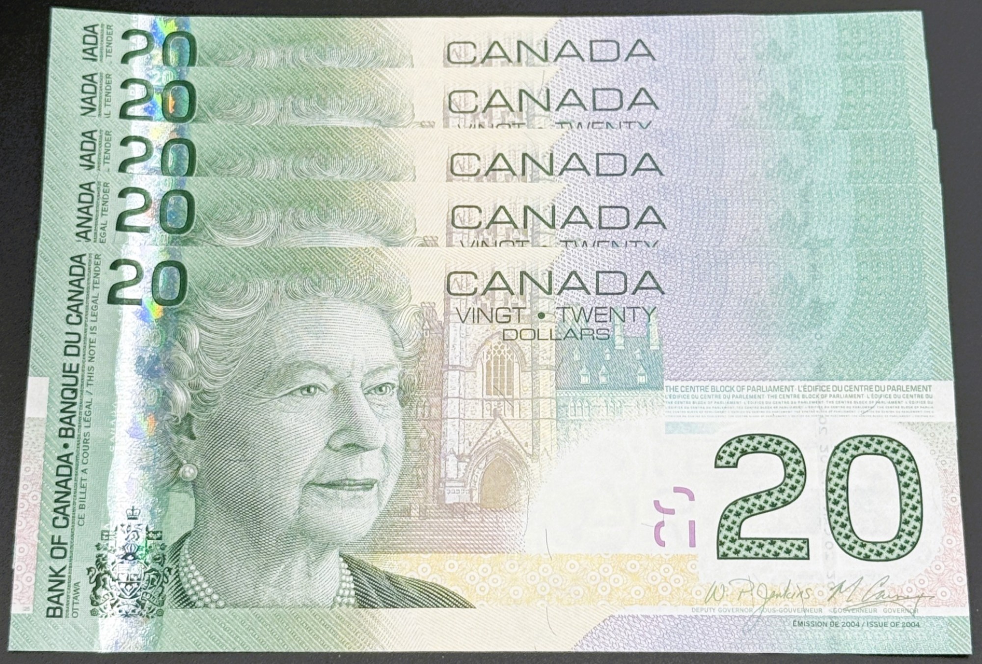 Banque du Canada – 20 Dollars 2004 – 5 Consécutifs – Jenkins/Carney – Préfixe FIJ – UNC