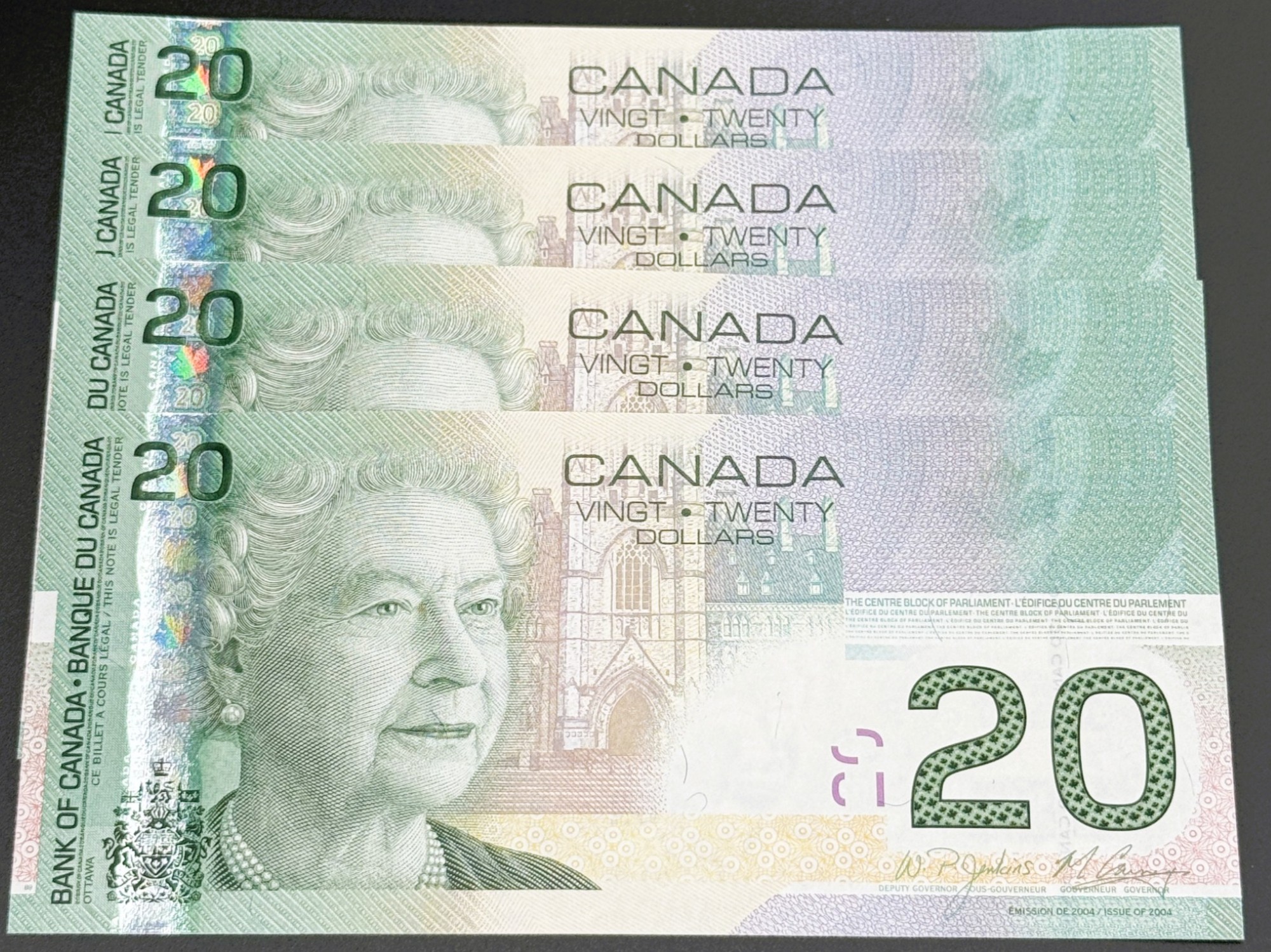 Banque du Canada – 20 Dollars 2004 – 4 Consécutifs – Jenkins/Carney – Préfixe ARU – UNC