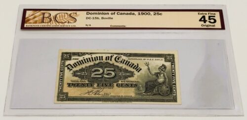Cet exemplaire du billet de 25 cents du Dominion du Canada de 1923, surnommé « shinplaster », portant les signatures de McCavour et Saunders et classé EF, constitue la dernière émission fractionnaire avant le retrait des billets de petite dénomination. Imprimé par la Canadian Bank Note Company, ce billet se distingue par son format réduit, bien plus petit que les billets standards, et par sa composition verte aux motifs géométriques et floraux symétriques. Le recto présente le portrait du roi George V, tandis que le verso arbore une gravure complexe typique des émissions du Dominion. Malgré une légère usure propre au grade EF, l’exemplaire conserve une belle netteté et une forte valeur historique en tant que vestige de l’économie canadienne d’avant la Banque centrale.
