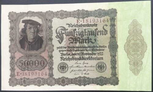 Émis à Berlin le 2 décembre 1922, ce billet de 5 000 Marks reflète l’escalade inflationniste qui frappe l’Allemagne au sortir de la Première Guerre mondiale. Son design présente une typographie gothique expressive, un portrait masculin en tenue d’époque, et deux aigles impériaux, vestiges symboliques d’un ordre en mutation. Dans un état VF (Very Fine), le papier conserve sa structure, les détails restent nets, et les couleurs bien présentes. Ce billet est recherché pour sa valeur historique, sa présentation intacte, et son rôle dans une période de déséquilibre économique extrême. Il constitue une pièce de collection emblématique, à la croisée de l’art fiduciaire et du contexte géopolitique de l’Allemagne de l’entre‑deux‑guerres.