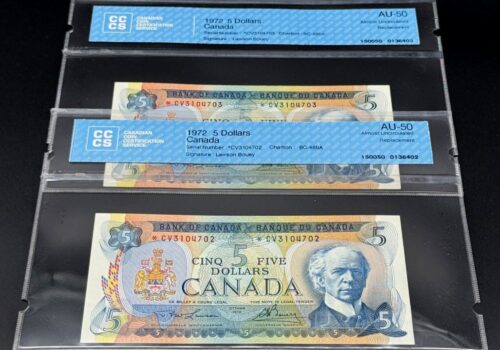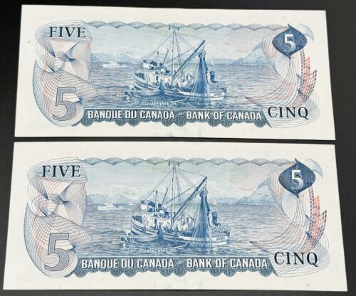 Émis dans le cadre de la série »Paysage », cet ensemble de cinq billets de 5 dollars canadiens, portant les signatures de Beattie et Rasminski, le préfixe PS et certifiés UNC64, constitue une survivance remarquable de cette première grande émission moderne. Le recto présente l’effigie révisée de la Reine Élisabeth II dans la version du « Portrait modifié », tandis qu’au verso figure la scène emblématique des Chutes Otter au Yukon. La présence d’une suite complète de cinq numéros consécutifs confère à l’ensemble une cohérence d’origine rare, particulièrement impressionnante pour des billets de cette génération. Le grade UNC64 assure une fraîcheur et une homogénéité qui renforcent encore son attrait historique et numismatique.