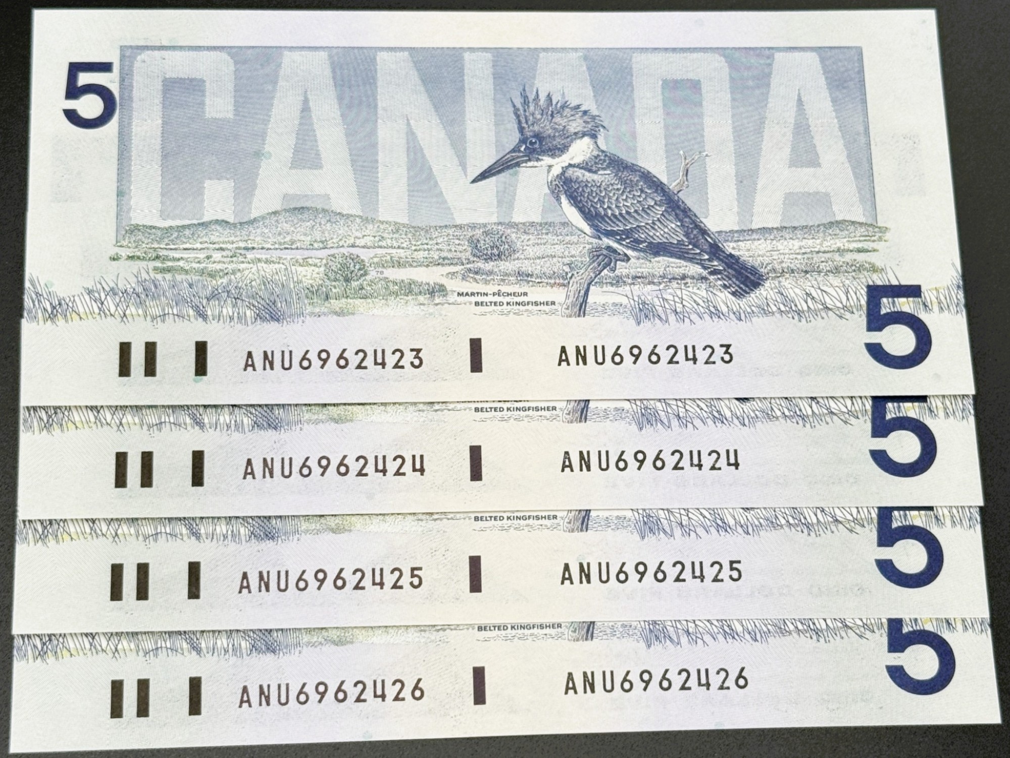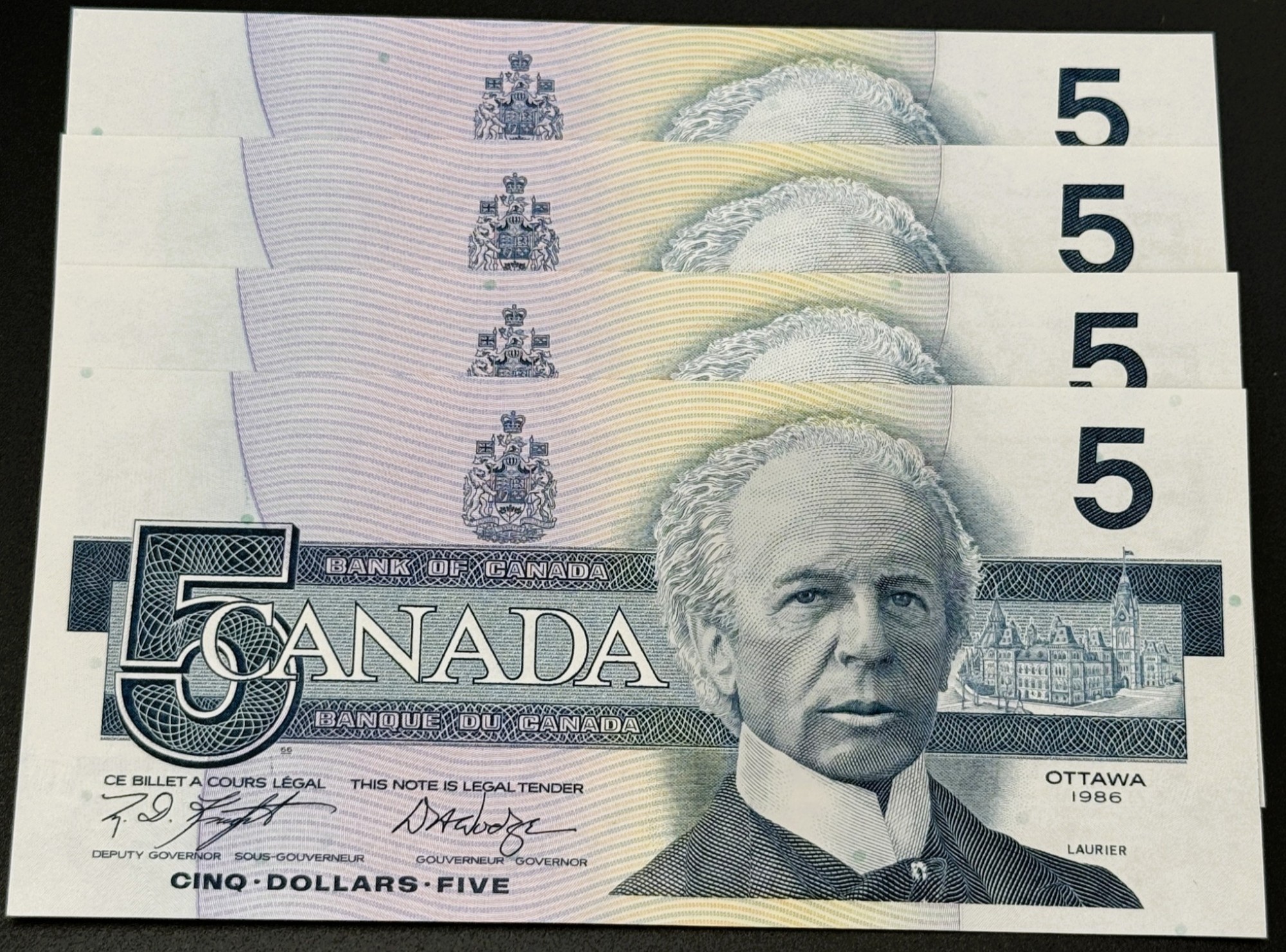 Banque du Canada – 5 Dollars 1986 – 4 Consécutifs – Knight/Dodge – Préfixe ANU – UNC