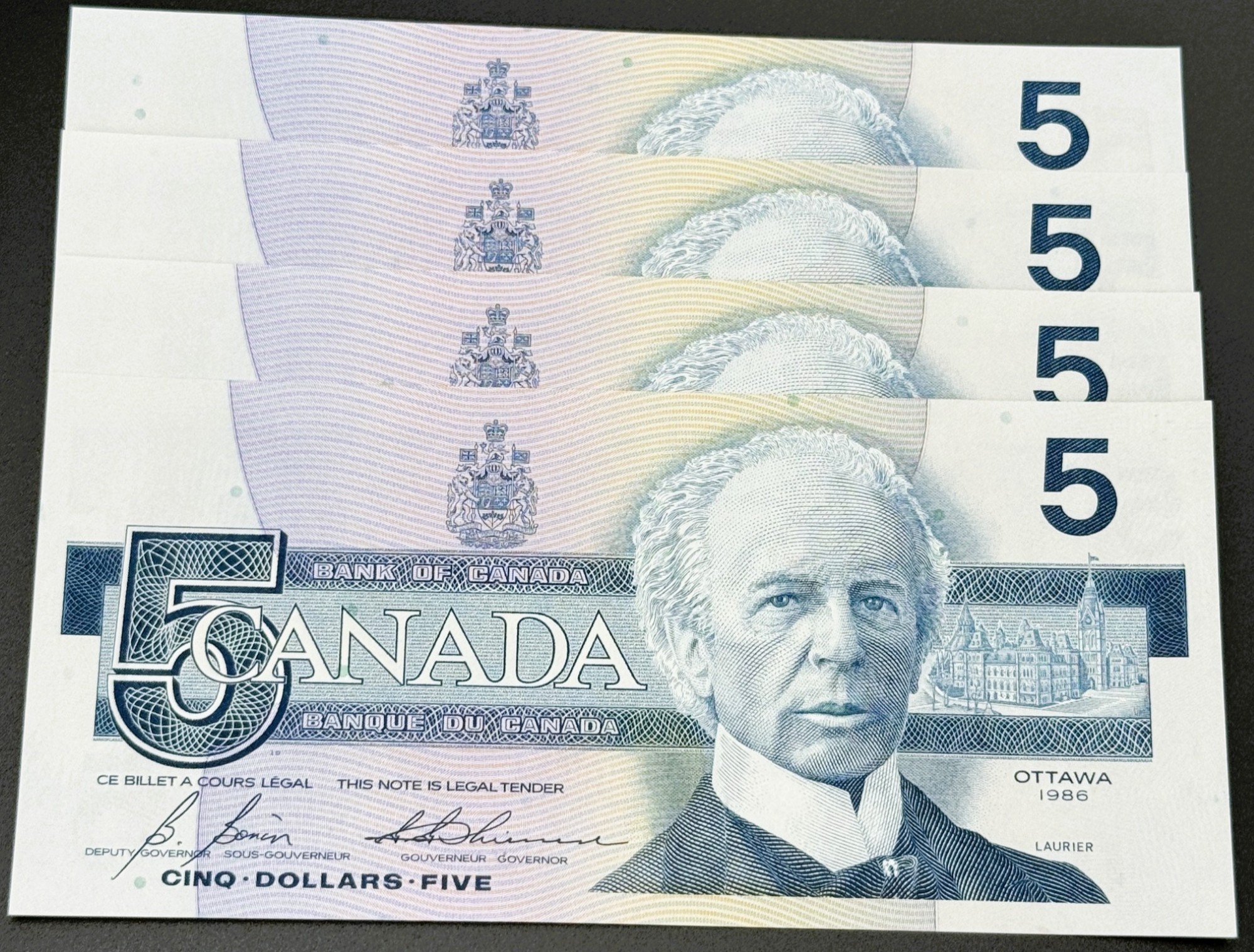 Banque du Canada – 5 Dollars 1986 – 4 Consécutifs – Bonin/Thiessen – Préfixe GPU – UNC