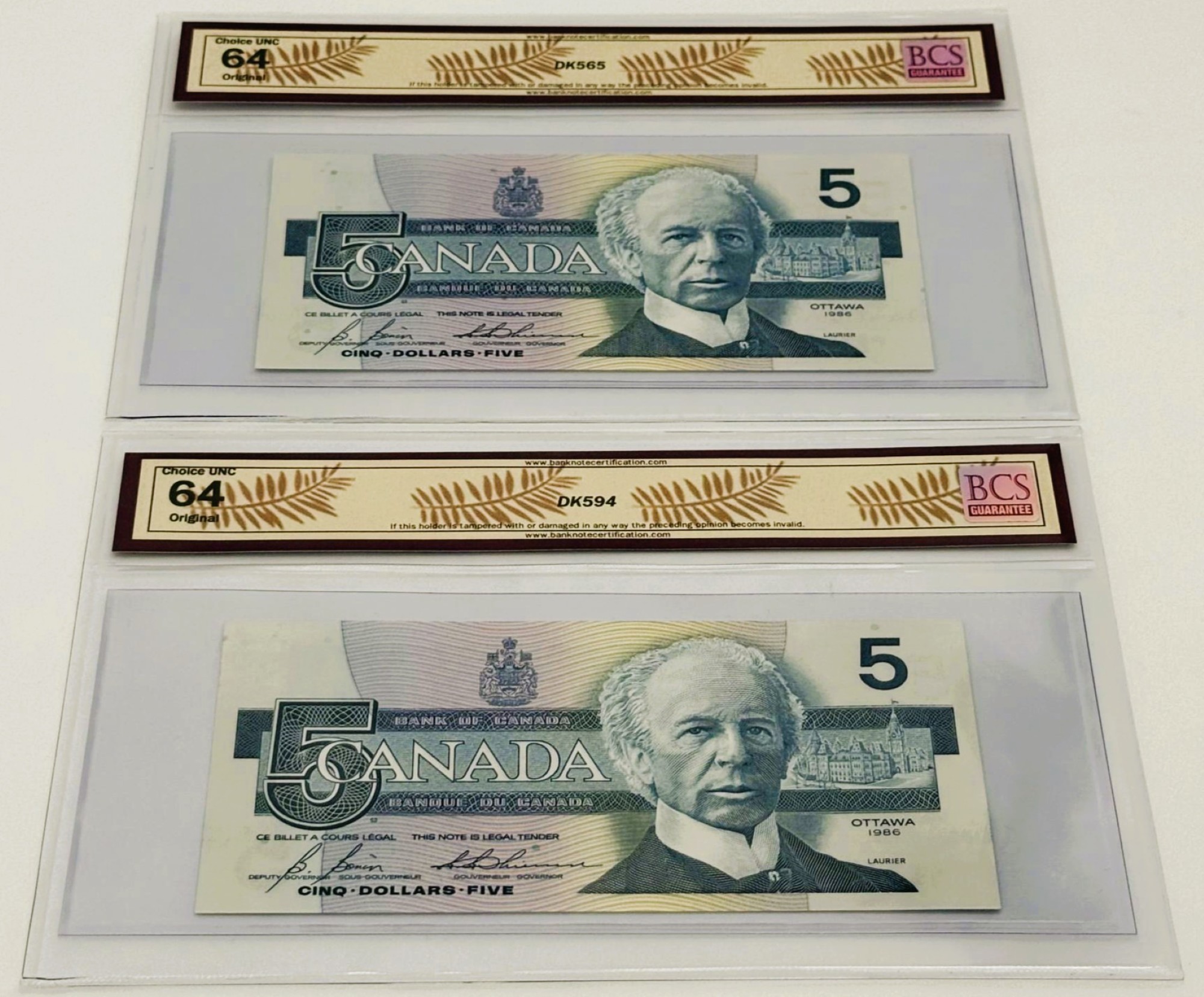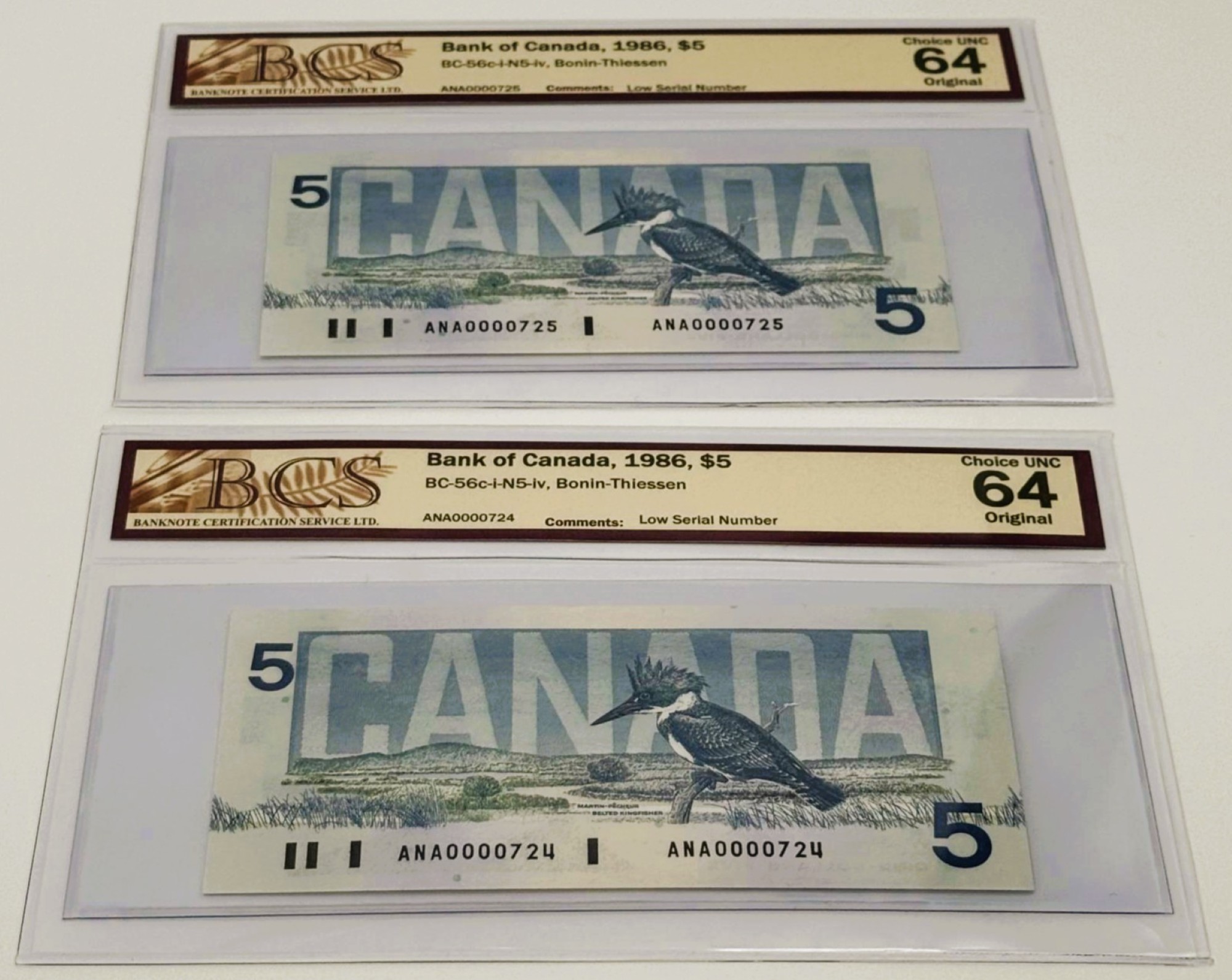 Banque du Canada – 5 Dollars 1986 – 2 Consécutifs – Numéro de Série Bas – Bonin/Thiessen – Préfixe ANA – UNC64 – BC-56c-i-N5-iv