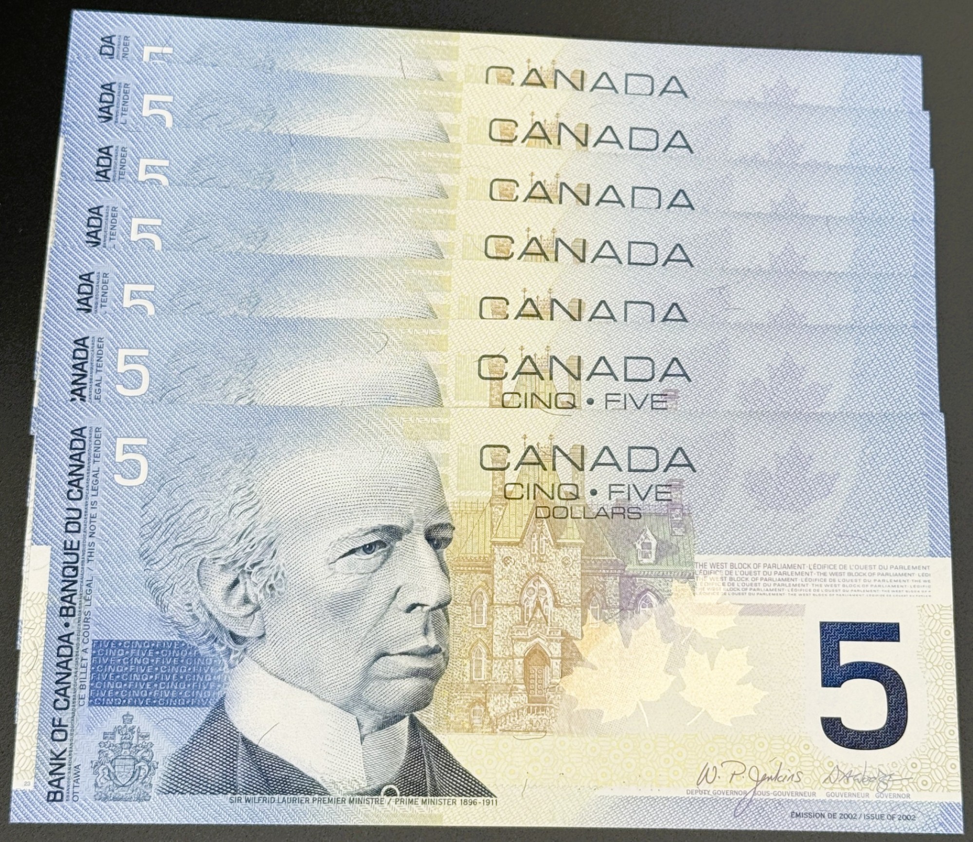 Banque du Canada – 5 Dollars 2002 – 7 Consécutifs – Jenkins/Dodge – Préfixe HOB – UNC