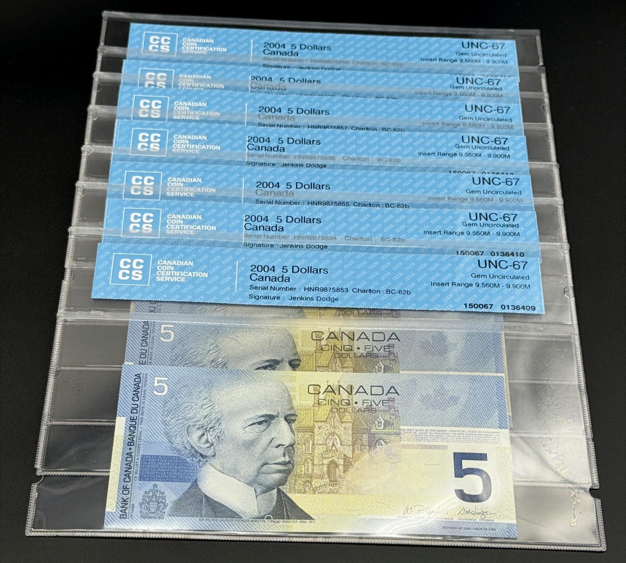 Banque du Canada – 5 Dollars 2004 – Remplaement – 7 Consécutifs – Jenkins/Dodge – Préfixe HNR – Certifié GEM67 – BC-62b