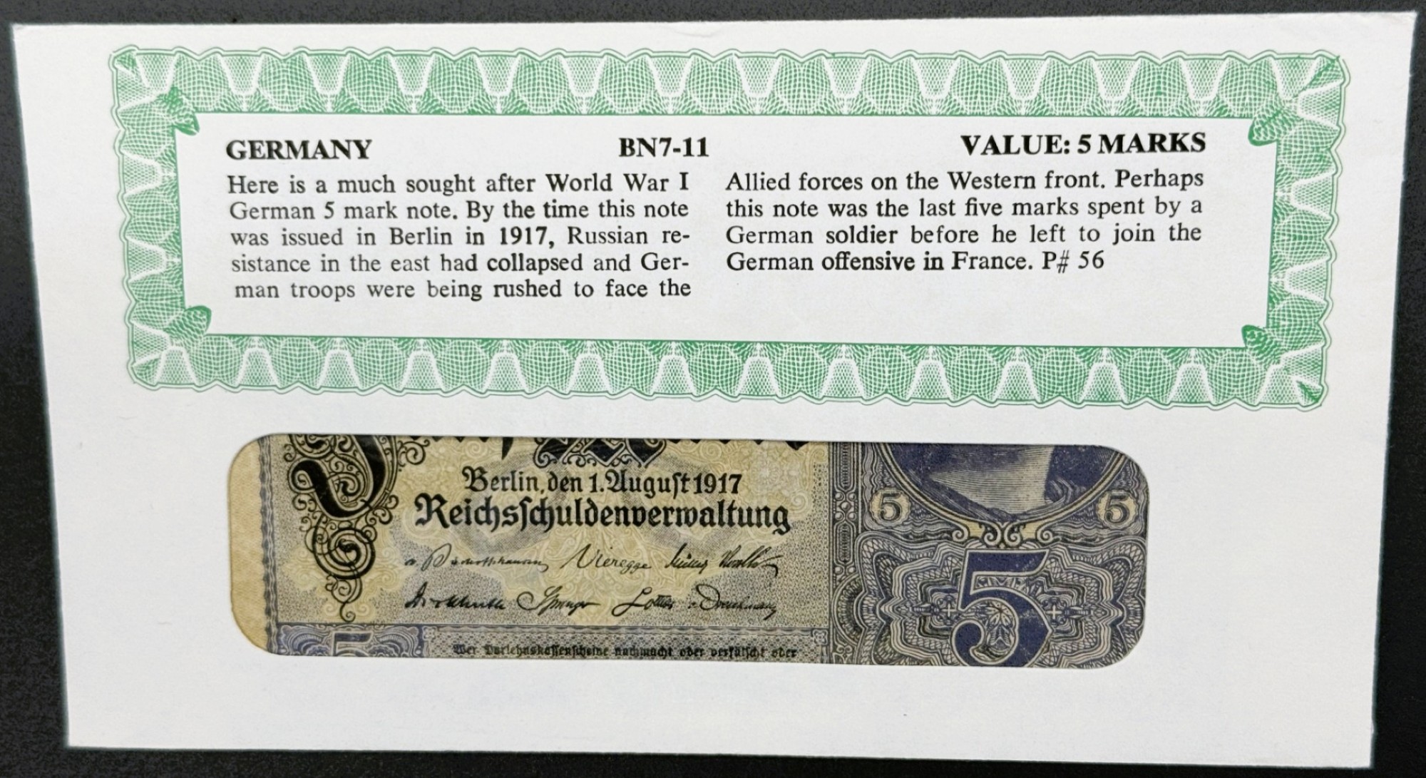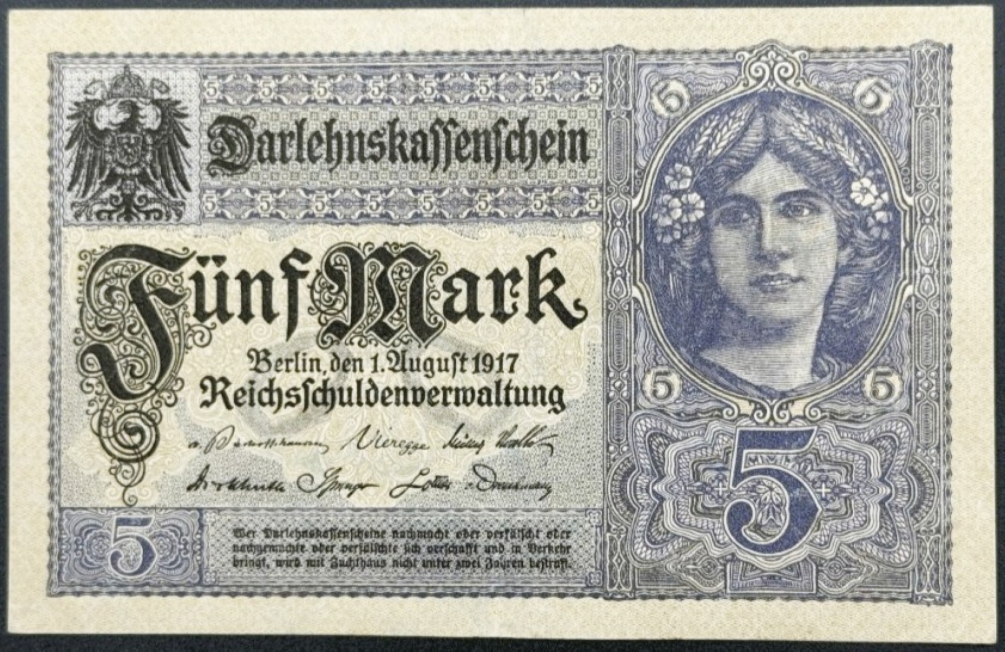 Émis par la Reichsbank en 1917, ce billet de 5 Marks incarne la dernière phase de la monnaie impériale allemande avant la chute du Kaiserreich. Son design, marqué par la mention “Darlehnskassenschein”, reflète les mécanismes de financement de guerre, où les billets servaient de bons de prêt garantis par l’État. Dans un état VF (Very Fine), le papier conserve sa structure, les motifs restent nets, et les couleurs bien présentes. Son esthétique mêle ornementation classique, typographie gothique, et symétrie rigoureuse, typiques de l’Allemagne impériale. Ce billet est recherché pour sa valeur historique, sa présentation intacte, et son rôle dans une période charnière de l’histoire monétaire allemande. Il constitue une pièce de collection emblématique, à la croisée de l’art fiduciaire et du contexte géopolitique de la Première Guerre mondiale