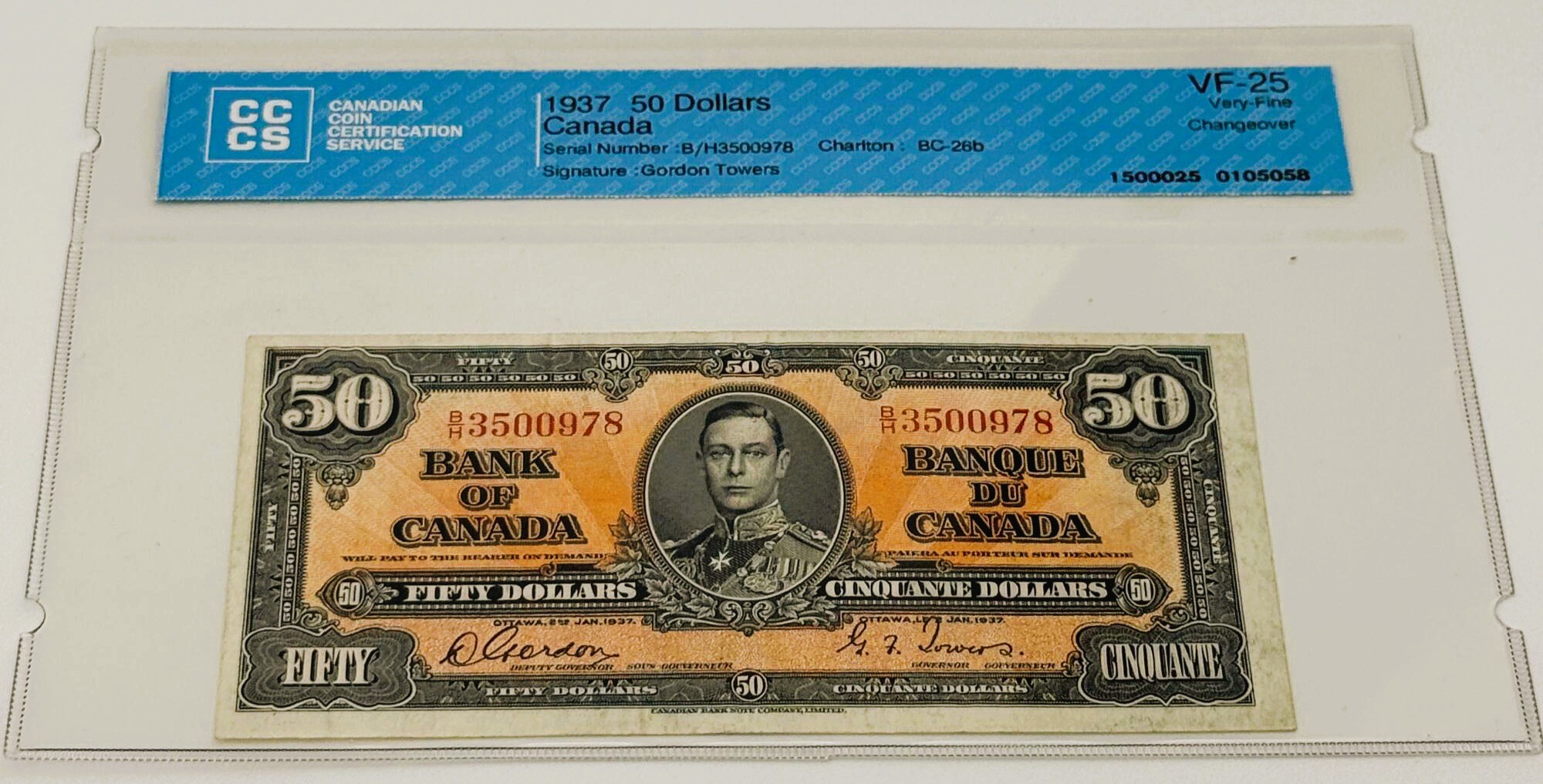 Banque du Canada – 50 Dollars 1937 – Gordon/Towers – Préfixe BH – Certifié – VF25 – BC-26b – Changeover