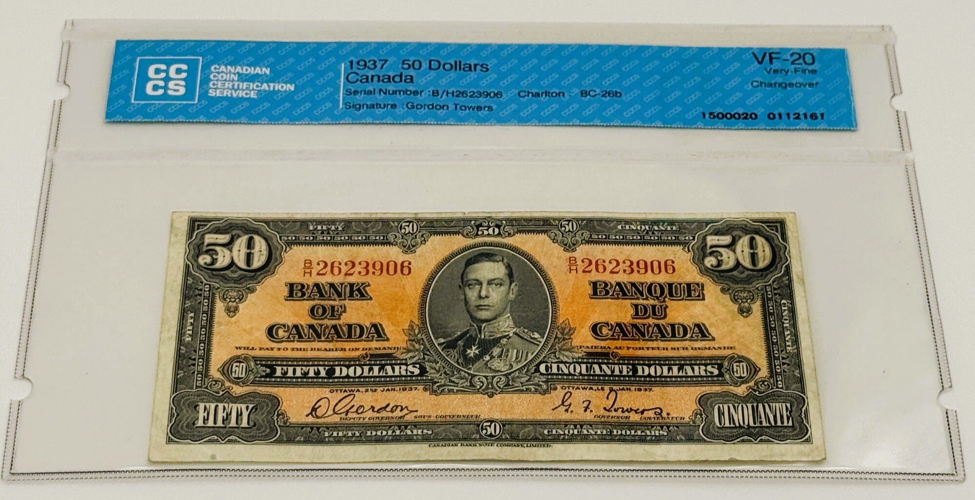 Banque du Canada – 50 Dollars 1937 – Gordon/Towers – Préfixe BH – Certifié – VF20 – BC-26b – Changeover