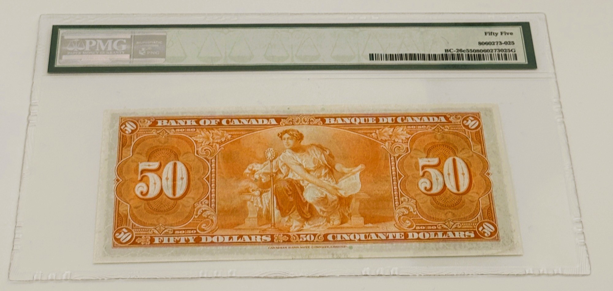 Émis dans la première série complète de la Banque du Canada, ce billet de 50 Dollars 1937 incarne la jeunesse institutionnelle de la banque centrale, fondée et opérationnelle dès 1935. Le recto présente le portrait du roi George VI, symbole de continuité monarchique et de stabilité à la veille de la Seconde Guerre mondiale, encadré par un décor ornemental riche et solennel. Le verso illustre une allégorie de la Modernité, avec une figure féminine tenant une roue dentée, accompagnée de symboles industriels et techniques, célébrant le progrès et la puissance économique du Canada. Portant les signatures de Coyne et Towers et le préfixe BH, cet exemplaire se distingue par une rareté exceptionnelle : certifié AU55, il atteint un grade très élevé et particulièrement rare pour cette coupure, offrant des détails nets, des couleurs vibrantes et une conservation remarquable malgré une usure minime. Ce billet conjugue prestige patrimonial, authenticité et rareté, séduisant autant par son état supérieur que par la force narrative de son iconographie institutionnelle.