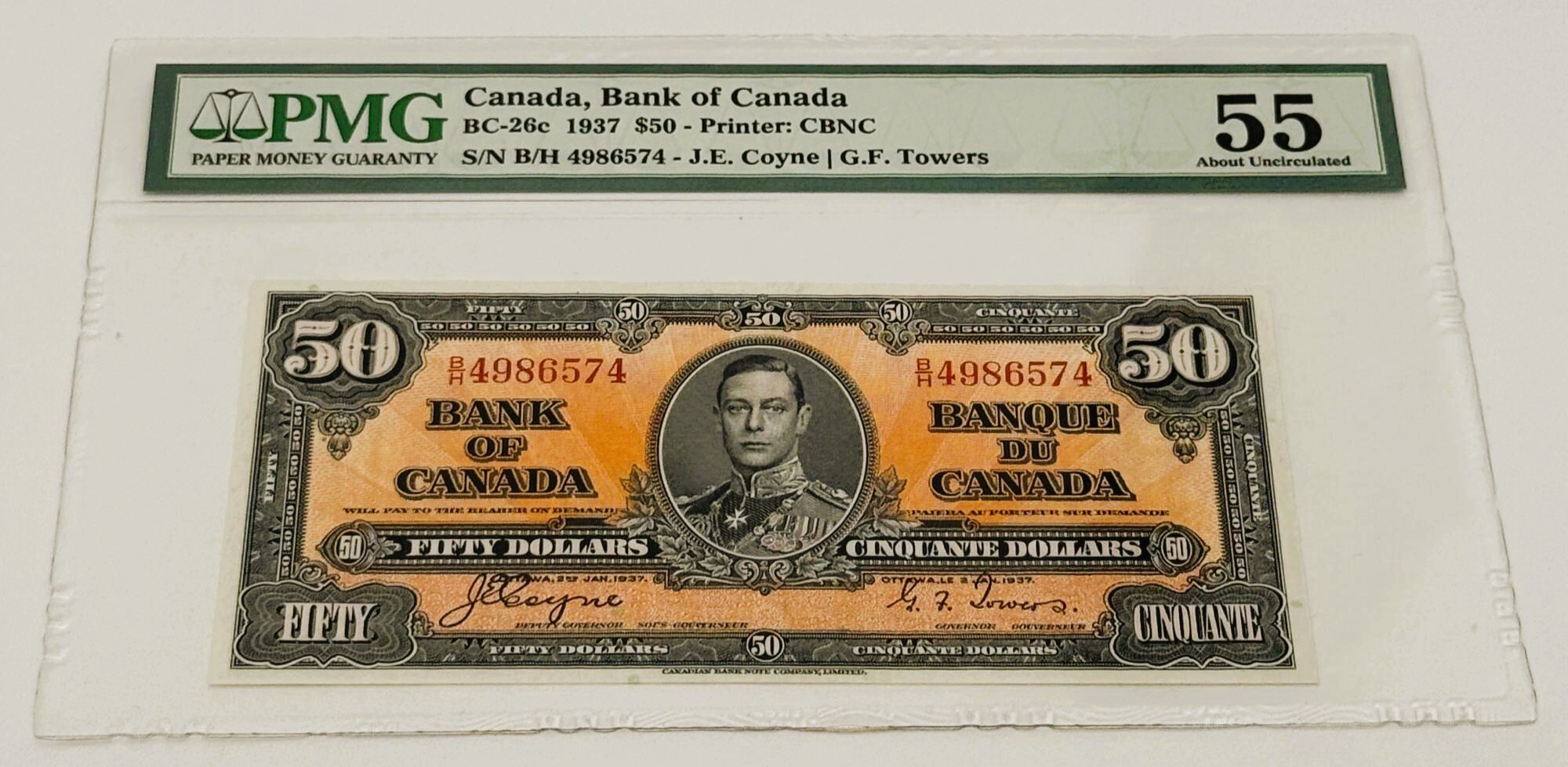 Banque du Canada – 50 Dollars 1937 – Coyne/Towers – Préfixe BH – Certifié – Au55 – BC-26c