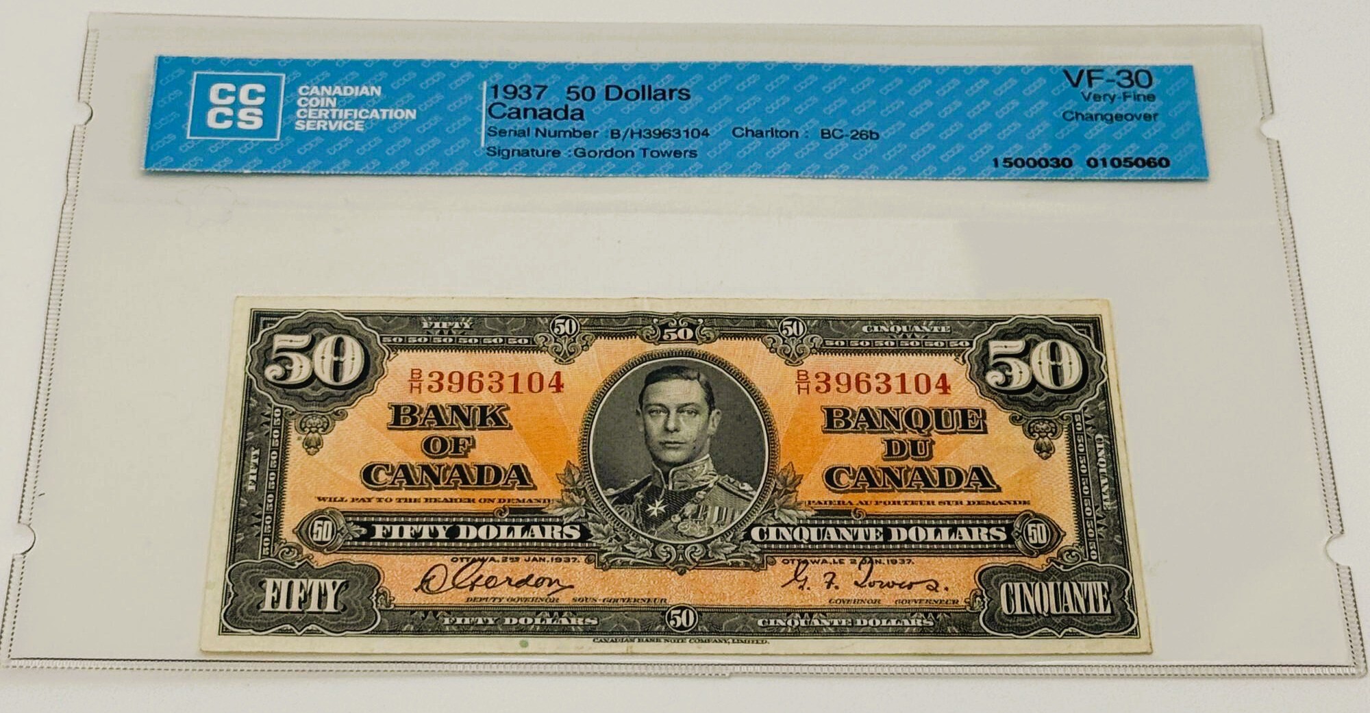 Banque du Canada – 50 Dollars 1937 – Gordon/Towers – Préfixe BH – Certifié – VF30 – BC-26b – Changeover