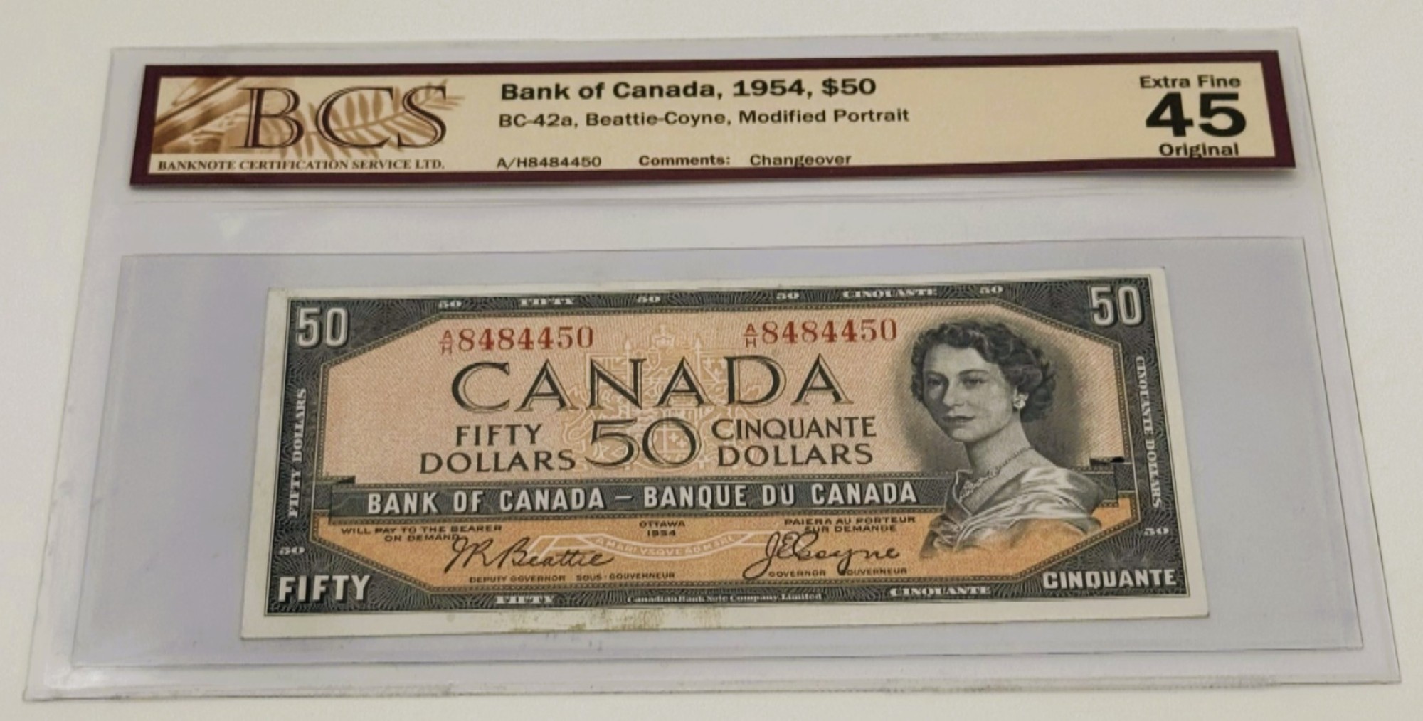 Banque du Canada – 50 Dollars 1954 – Beattie/Coyne – Préfixe A/H – EF45 – BC-42a – Changeover – Portrait modifié