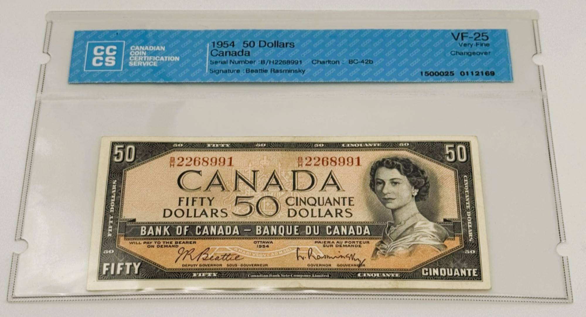 Banque du Canada – 50 Dollars 1954 – Beattie/Rasminski – Préfixe B/H – VF25 – BC-42b – Changeover