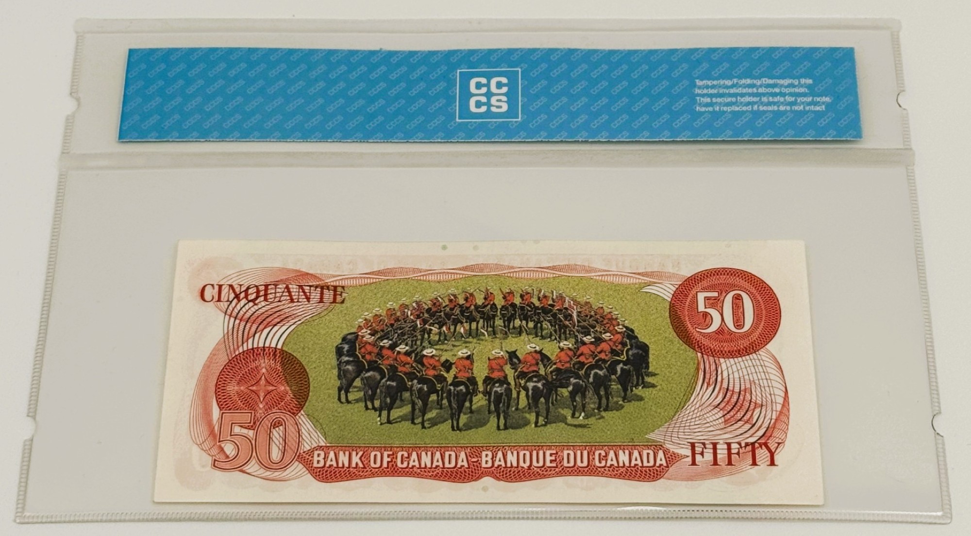 Ce billet de 50 dollars émis en 1975 par la Banque du Canada se distingue par son état de conservation remarquable, gradé AU50, qui témoigne d’une circulation minimale et d’une fraîcheur visuelle notable. Arborant le préfixe EHL et signé par Crow et Bouey, il incarne une configuration classique de la série, prisée pour son équilibre entre accessibilité et raffinement. Le recto présente le portrait de William Lyon Mackenzie King, Premier ministre au plus long mandat de l’histoire canadienne, gravé avec finesse dans une palette brun-rouge aux accents institutionnels. La composition typographique, les signatures officielles et le préfixe distinct confèrent à ce billet une présence sobre et affirmée. Au verso, une scène emblématique illustre le Carrousel de la Gendarmerie royale du Canada, avec les chevaux en formation exécutant la figure du « Dôme ». Rendue par procédé lithographique — une exception technique dans la série — cette image célèbre l’élégance cérémonielle et la discipline de l’institution nationale, tout en conférant au billet une texture visuelle unique. Pièce représentative et bien conservée, ce billet incarne la rigueur graphique, la stabilité institutionnelle et le raffinement technique qui caractérisent le patrimoine fiduciaire canadien.