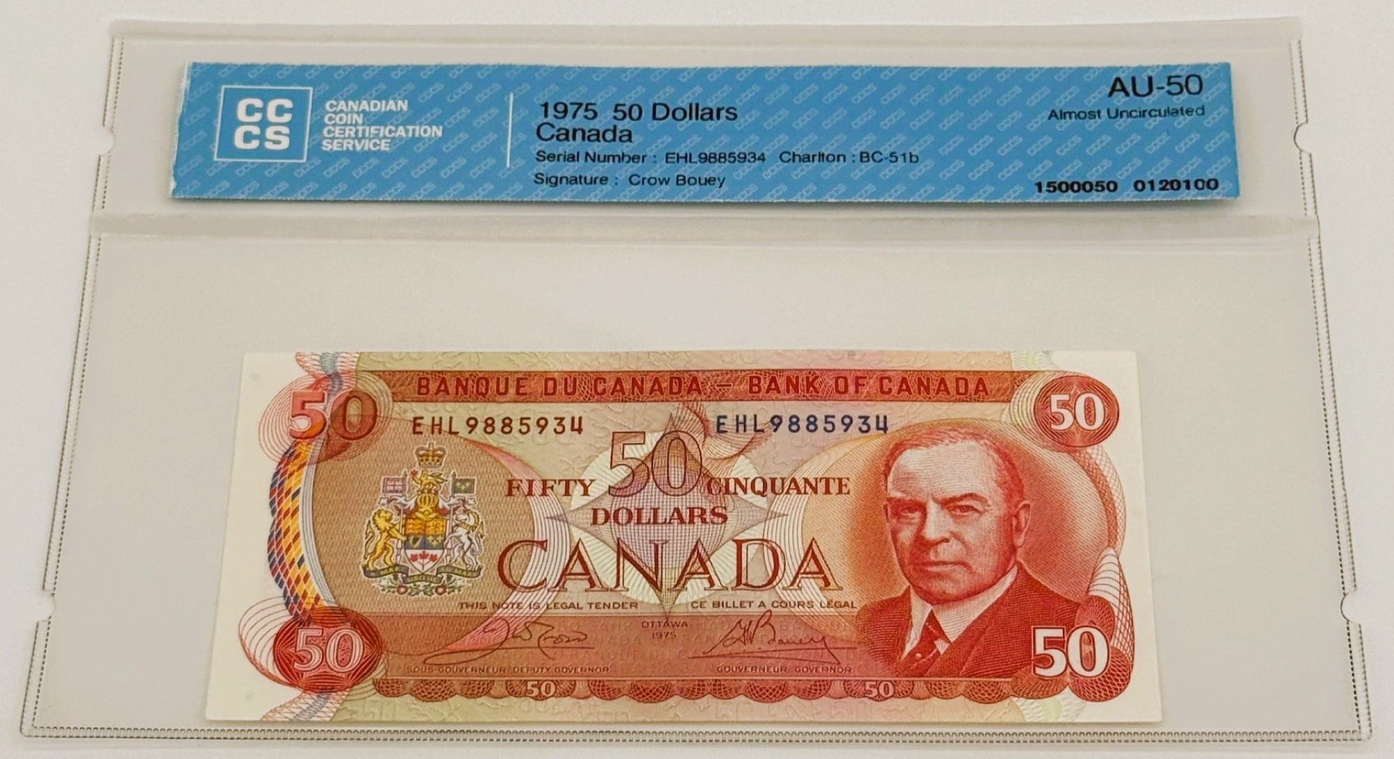 Banque du Canada – 50 Dollars 1975 – Crow/Bouey – Préfixe EHL – AU50 – BC-51b
