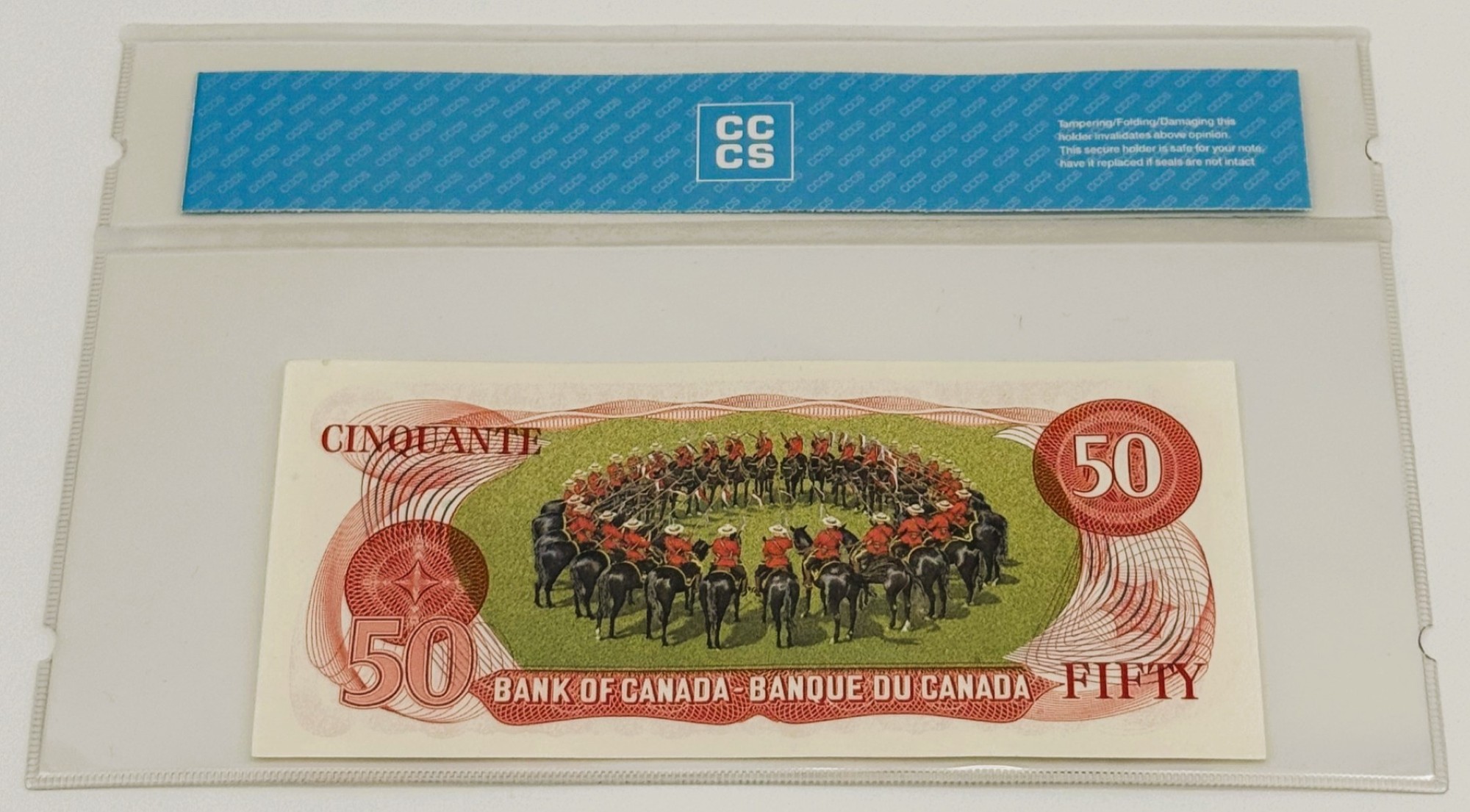 Ce billet de 50 dollars émis en 1975 par la Banque du Canada présente une configuration classique, rehaussée par une signature moins fréquente : celle de Lawson aux côtés de Bouey. Arborant le préfixe HB et gradé AU50, il témoigne d’une circulation minimale et d’une conservation remarquable, avec des détails nets et une structure bien préservée. Le recto met en valeur le portrait de William Lyon Mackenzie King, Premier ministre au plus long mandat de l’histoire canadienne, gravé avec finesse dans une palette brun-rouge aux accents institutionnels. La signature de Lawson, plus rare dans cette série, confère à ce billet une nuance distinctive et recherchée. Au verso, une scène emblématique illustre le Carrousel de la Gendarmerie royale du Canada, avec les chevaux en formation exécutant la figure du « Dôme ». Rendue par procédé lithographique — une exception technique dans la série — cette image célèbre l’élégance cérémonielle et la discipline de l’institution nationale, tout en conférant au billet une texture visuelle unique. Pièce à la fois représentative et singulière, ce billet incarne la richesse du patrimoine fiduciaire canadien, où variation de signature, qualité de conservation et esthétique narrative se conjuguent avec force.