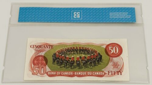 Ce billet de 50 dollars émis en 1975 par la Banque du Canada incarne une rare convergence de caractéristiques recherchées. Il s’agit d’un billet de remplacement, identifié par le préfixe EHX, et arborant un numéro radar à quatre chiffres — une symétrie numérique prisée des collectionneurs. Signé par Crow et Bouey, ce billet gradé EF45 témoigne d’un état de conservation supérieur. Sa combinaison unique de série, signature et configuration en fait une pièce remarquable au sein de l’univers numismatique canadien. Le recto présente le portrait de William Lyon Mackenzie King, Premier ministre au plus long mandat de l’histoire canadienne, gravé avec finesse. Le verso illustre une formation équestre de la Gendarmerie royale du Canada — le célèbre Carrousel de la RCMP, exécutant la figure du « Dôme ». Cette scène, rendue par procédé lithographique plutôt que gravée, confère au billet une texture visuelle distincte et marque une exception technique dans la série. Elle célèbre l’héritage cérémoniel et l’élégance disciplinée de l’institution nationale. Pièce mythique et prisée, ce billet incarne la rareté technique, la profondeur historique et l’attrait visuel qui en font l’un des joyaux les plus convoités du patrimoine fiduciaire canadien.