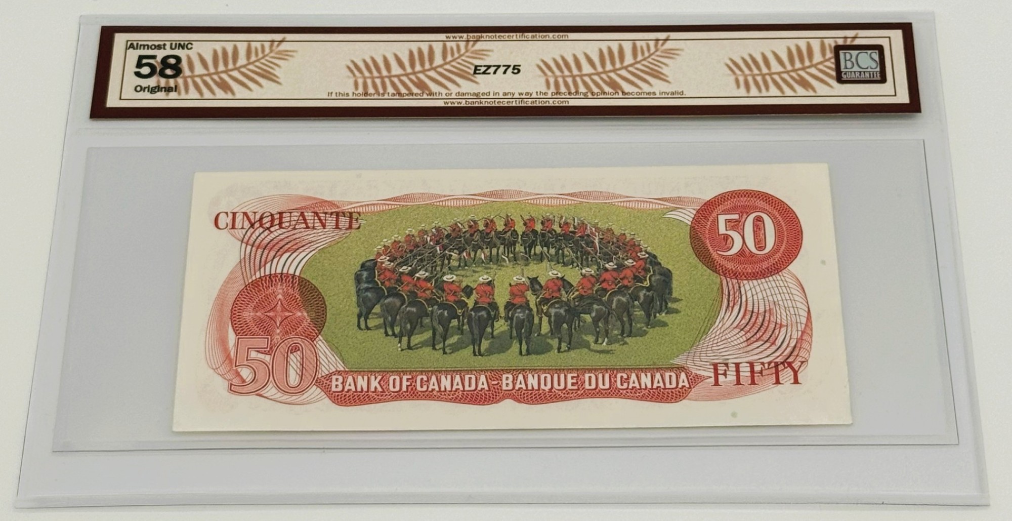 Ce billet de 50 dollars émis en 1975 par la Banque du Canada se distingue par sa signature Lawson/Bouey et son préfixe HC, une combinaison moins fréquente dans la série. Gradé AU58, il présente une qualité de conservation exceptionnelle, avec une circulation à peine perceptible et une fraîcheur visuelle remarquable. Le recto met en valeur le portrait de William Lyon Mackenzie King, Premier ministre au plus long mandat de l’histoire canadienne, gravé avec finesse dans une palette brun-rouge aux accents institutionnels. La signature de John R. Lawson, plus rare dans cette émission, confère à ce billet une nuance distinctive et recherchée. Au verso, le Carrousel de la Gendarmerie royale du Canada est représenté dans sa figure emblématique du « Dôme », exécutée par les chevaux en formation. Rendue par procédé lithographique — une singularité technique dans cette série — cette scène célèbre l’élégance cérémonielle, la discipline et l’héritage symbolique de l’institution nationale. Pièce raffinée et singulière, ce billet conjugue rareté de signature, qualité de frappe et richesse narrative, s’imposant comme un jalon convoité du patrimoine fiduciaire canadien.