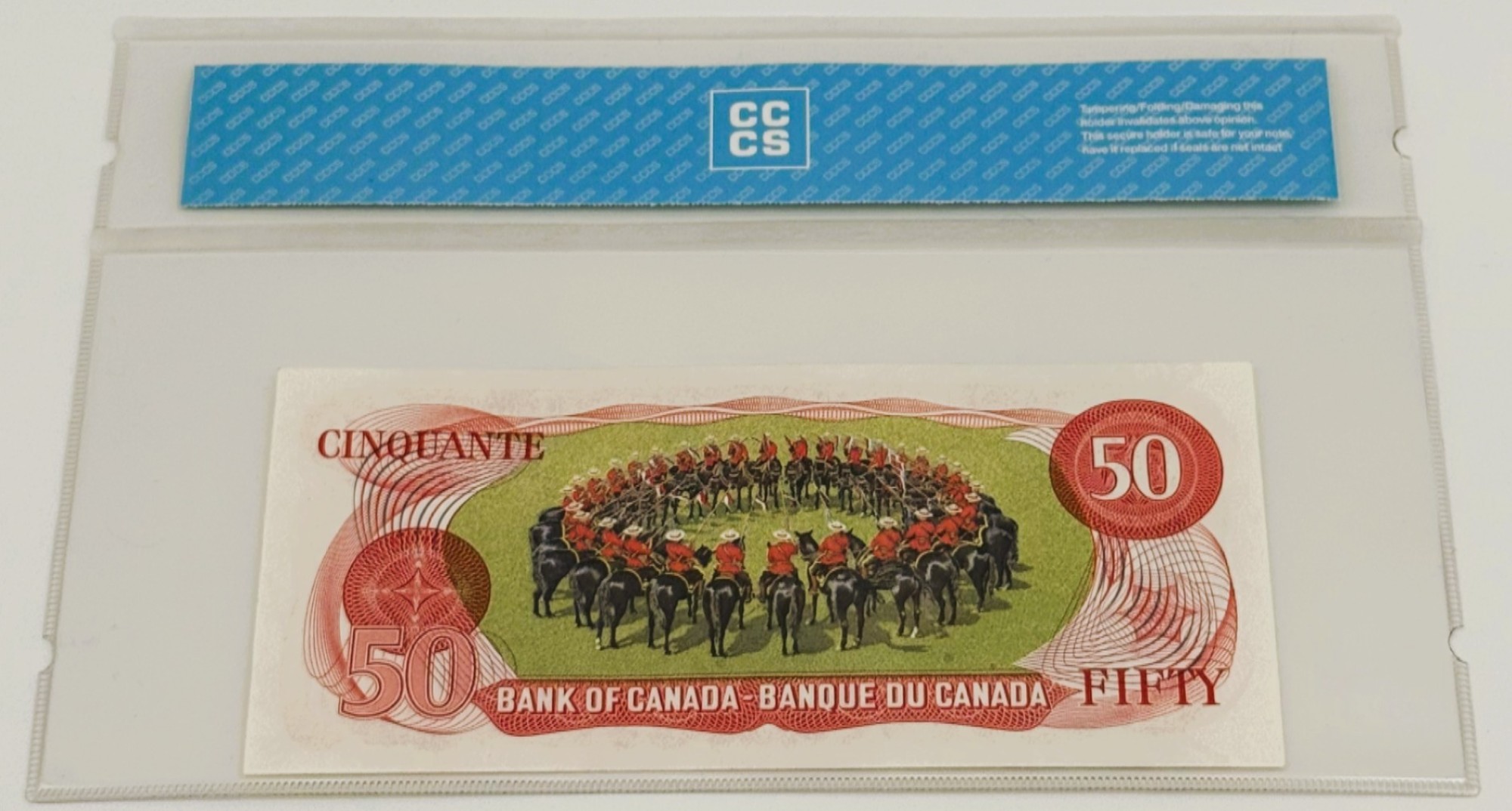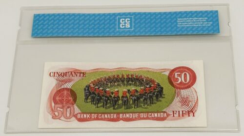 Ce billet de 50 dollars émis en 1975 par la Banque du Canada se distingue par son état incirculé, gradé UNC60, qui témoigne d’une fraîcheur absolue et d’une qualité de conservation irréprochable. Arborant le préfixe EHL et signé par Crow et Bouey, il incarne une configuration classique de la série, sublimée par sa condition numismatique idéale. Le recto présente le portrait de William Lyon Mackenzie King, Premier ministre au plus long mandat de l’histoire canadienne, gravé avec finesse dans une palette brun-rouge aux accents institutionnels. La netteté des détails, la vivacité des couleurs et l’absence de toute trace de manipulation confèrent à ce billet une présence remarquable. Au verso, le Carrousel de la Gendarmerie royale du Canada est représenté dans sa figure emblématique du « Dôme », exécutée par les chevaux en formation. Rendue par procédé lithographique — une singularité technique dans cette série — cette scène célèbre l’élégance cérémonielle, la discipline et l’héritage symbolique de l’institution nationale. Pièce d’exception, ce billet incirculé conjugue perfection technique, richesse narrative et prestige visuel, s’imposant comme l’un des joyaux les plus convoités du patrimoine fiduciaire canadien.