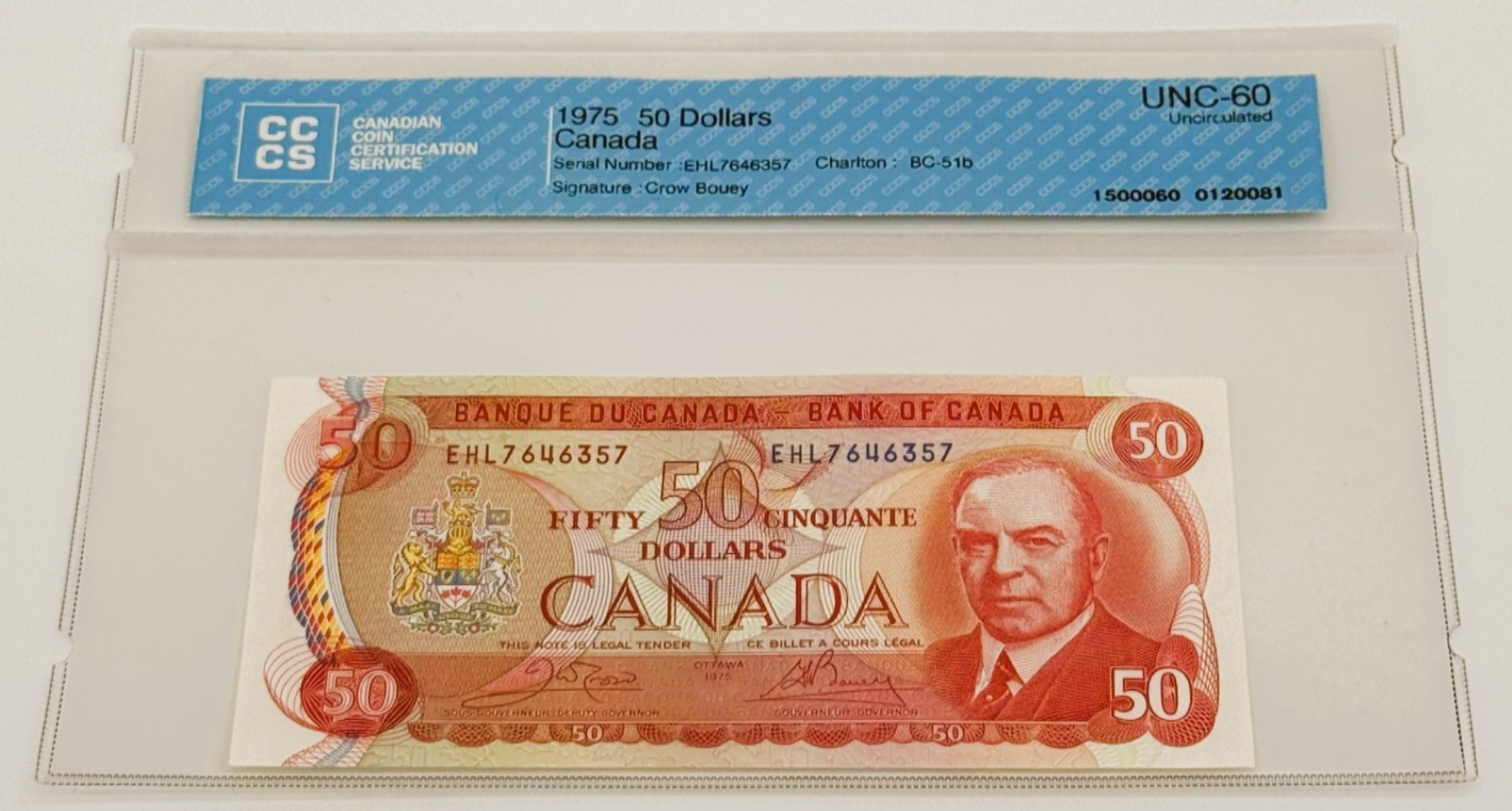 Banque du Canada – 50 Dollars 1975 – Crow/Bouey – Préfixe EHL – UNC60 – BC-51b