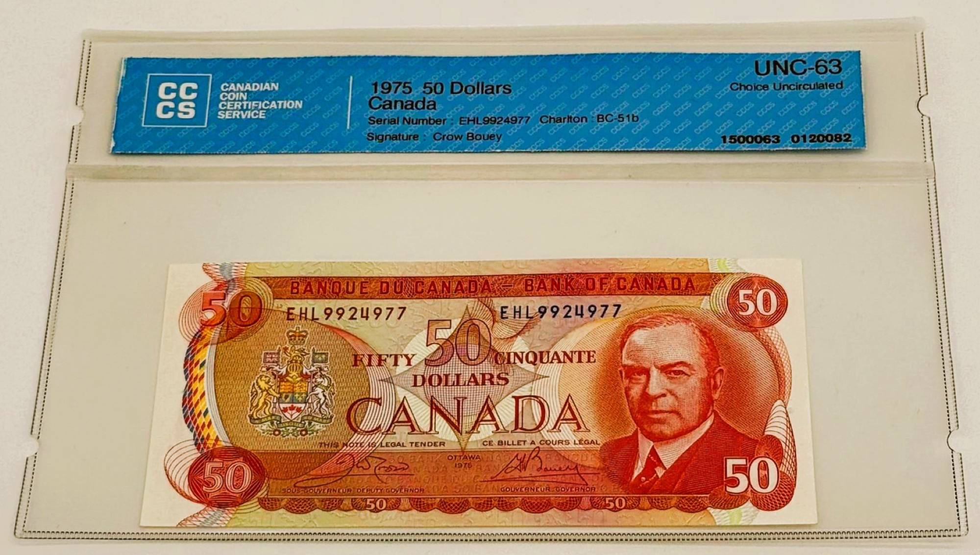 Banque du Canada – 50 Dollars 1975 – Crow/Bouey – Préfixe EHL – UNC63 – BC-51b