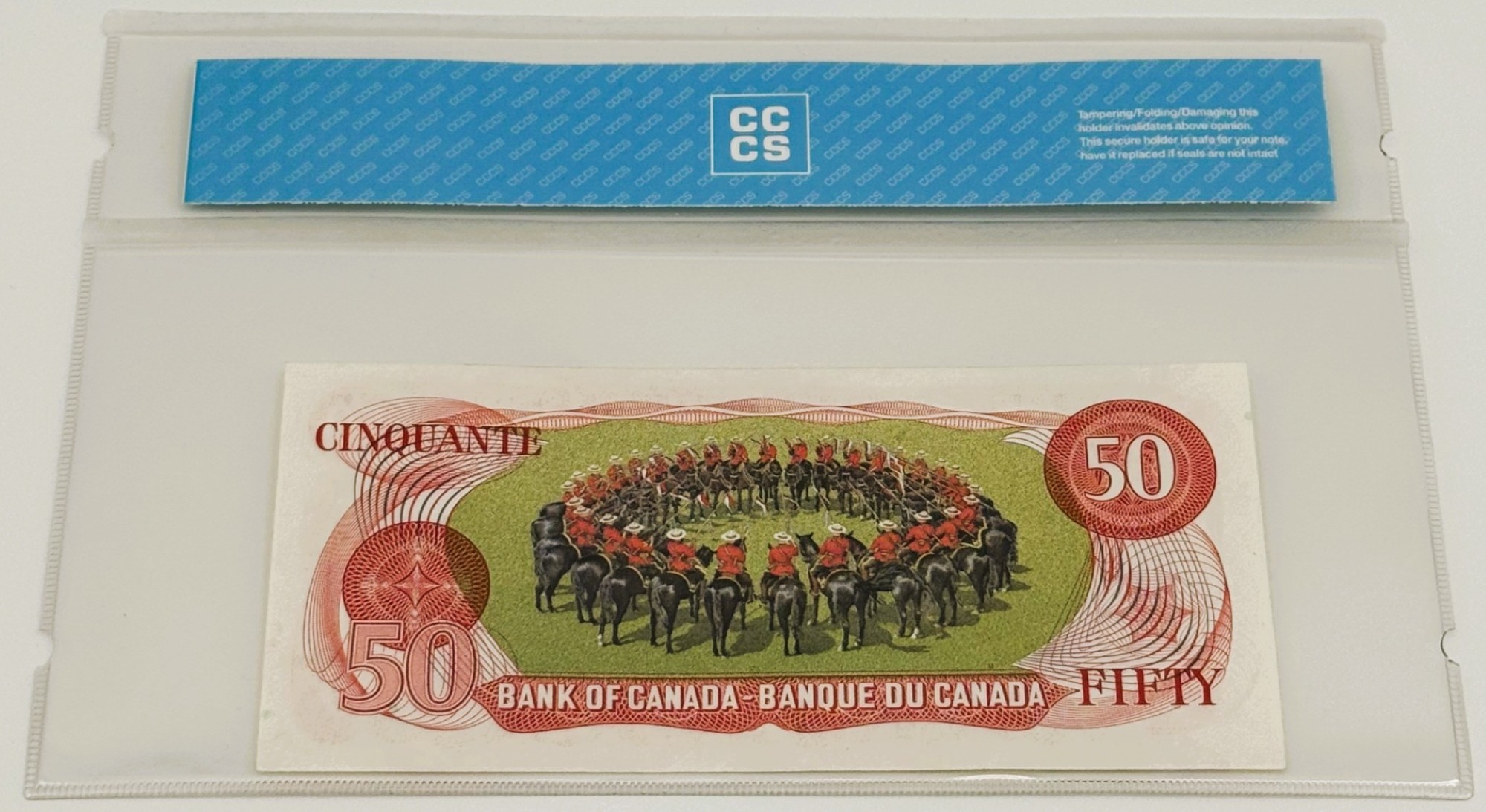 Ce billet de 50 dollars émis en 1975 par la Banque du Canada représente une configuration classique de la série, prisée pour son équilibre entre accessibilité et élégance. Arborant le préfixe EHL, il est signé par Crow et Bouey et gradé EF45, témoignant d’un état de conservation supérieur avec des détails nets et une structure bien préservée. Le recto présente le portrait de William Lyon Mackenzie King, Premier ministre au plus long mandat de l’histoire canadienne, gravé avec finesse dans une palette brun-rouge aux accents institutionnels. La composition typographique, les signatures officielles et le préfixe distinct confèrent à ce billet une présence sobre et affirmée. Au verso, une scène emblématique illustre le Carrousel de la Gendarmerie royale du Canada, avec les chevaux en formation exécutant la figure du « Dôme ». Rendue par procédé lithographique — une exception technique dans la série — cette image célèbre l’élégance cérémonielle et la discipline de l’institution nationale, tout en conférant au billet une texture visuelle unique. Pièce représentative de la série de 1975, ce billet incarne la rigueur graphique, la stabilité institutionnelle et le raffinement technique qui caractérisent le patrimoine fiduciaire canadien.