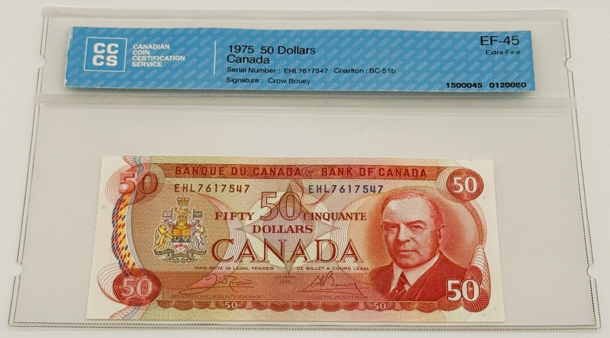 Banque du Canada – 50 Dollars 1975 – Crow/Bouey – Préfixe EHL – EF45 – BC-51b
