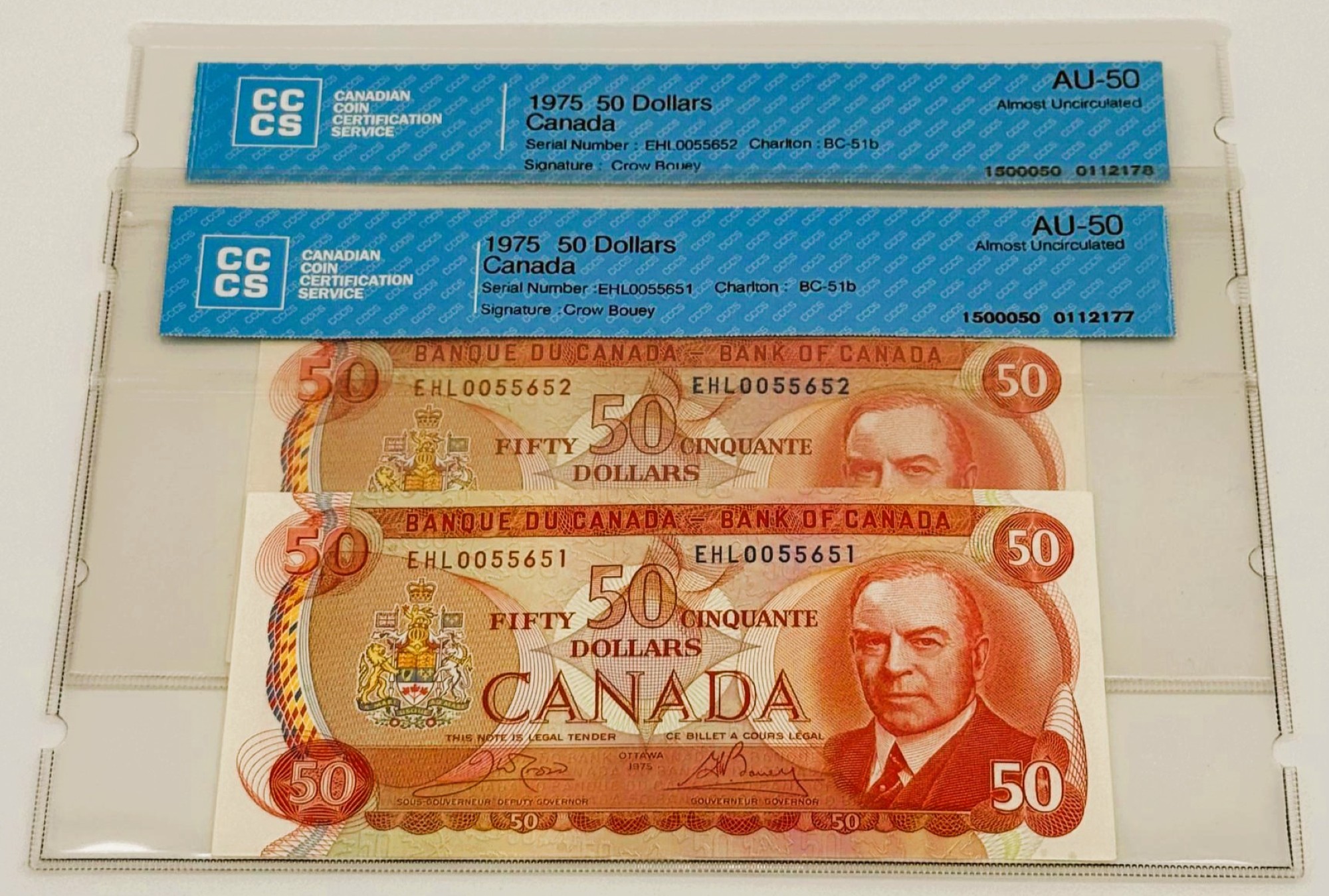 Banque du Canada – 50 Dollars 1975 – 2 Consécutifs – Crow/Bouey – Préfixe EHL – AU50 – BC-51b