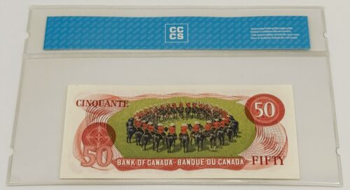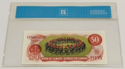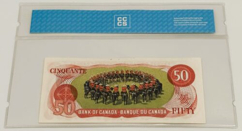 Cette série de trois billets de 50 dollars émis en 1975 par la Banque du Canada forme un ensemble cohérent et recherché. Arborant le préfixe EHM, tous signés par Crow et Bouey, et gradés EF45, ces billets témoignent d’une circulation modérée, tout en conservant une structure bien préservée et des détails nets. Le recto de chaque billet présente le portrait de William Lyon Mackenzie King, Premier ministre au plus long mandat de l’histoire canadienne, gravé avec finesse dans une palette brun-rouge aux accents institutionnels. L’alignement séquentiel des numéros de série confère à cette série une harmonie visuelle et une valeur ajoutée pour les collectionneurs. Au verso, le Carrousel de la Gendarmerie royale du Canada est représenté dans sa figure emblématique du « Dôme », exécutée par les chevaux en formation. Rendue par procédé lithographique, une singularité technique dans cette série, cette scène célèbre l’élégance cérémonielle, la discipline et l’héritage symbolique de l’institution nationale. Pièces jumelées dans une séquence fluide, ces trois billets consécutifs gradés EF45 incarnent la rigueur, la continuité et le charme du patrimoine fiduciaire canadien, dans une configuration accessible et élégante