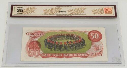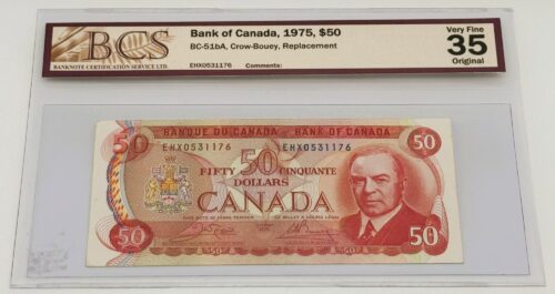 Ces deux billets de 50 dollars émis en 1988 par la Banque du Canada forment une paire consécutive remarquable au sein de la célèbre série Oiseaux. Arborant le préfixe FHY, signés par Knight et Dodge, et tous deux gradés UNC64, ils témoignent d’une conservation supérieure, avec une fraîcheur visuelle intacte et une structure irréprochable. Le recto présente le portrait de William Lyon Mackenzie King, Premier ministre au plus long mandat de l’histoire canadienne, dans une composition modernisée aux lignes épurées et aux contrastes affirmés. L’intégration typographique, les éléments de sécurité et la palette rouge dominante confèrent à ce billet une présence contemporaine, tout en conservant la solennité institutionnelle. Au verso, le Harfang des neiges (Bubo scandiacus) est représenté dans un environnement boréal stylisé, incarnant la majesté, la vigilance et la pureté du Nord canadien. Ce visuel emblématique de la série Oiseaux célèbre la faune nationale tout en affirmant l’identité visuelle du billet à travers une illustration naturaliste et poétique. Pièces jumelées dans une séquence harmonieuse, ces deux billets consécutifs gradés UNC64 incarnent la transition vers une nouvelle ère fiduciaire — entre modernité graphique, hommage à la biodiversité et excellence de conservation.