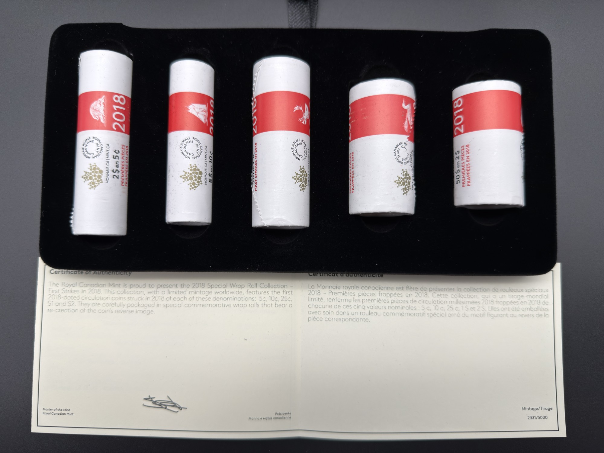 Émise en tirage limité à 10 000 exemplaires, cette Collection spéciale de rouleaux de pièces “Première frappe” – 2018 constitue un artéfact matériel contemporain de la Monnaie royale canadienne, marquant la deuxième année d’un programme dédié aux premières frappes officielles du pays. Le coffret réunit les rouleaux des 5 cents, 10 cents, 25 cents, 1 dollar et 2 dollars, chacun composé exclusivement de pièces issues des premiers instants de production, sélectionnées pour leur frappe nette, leur lustre initial et leur intégrité technique irréprochable. Présentés dans un emballage officiel scellé, ces rouleaux incarnent la volonté de la Monnaie de préserver les premiers témoins métalliques de chaque dénomination, offrant une survivance d’une pureté numismatique rare. Ensemble, ils forment un ensemble patrimonial moderne, témoin d’une tradition renouvelée où l’excellence de fabrication et la limitation volontaire du tirage confèrent à cette collection un statut recherché parmi les amateurs de pièces canadiennes contemporaines.