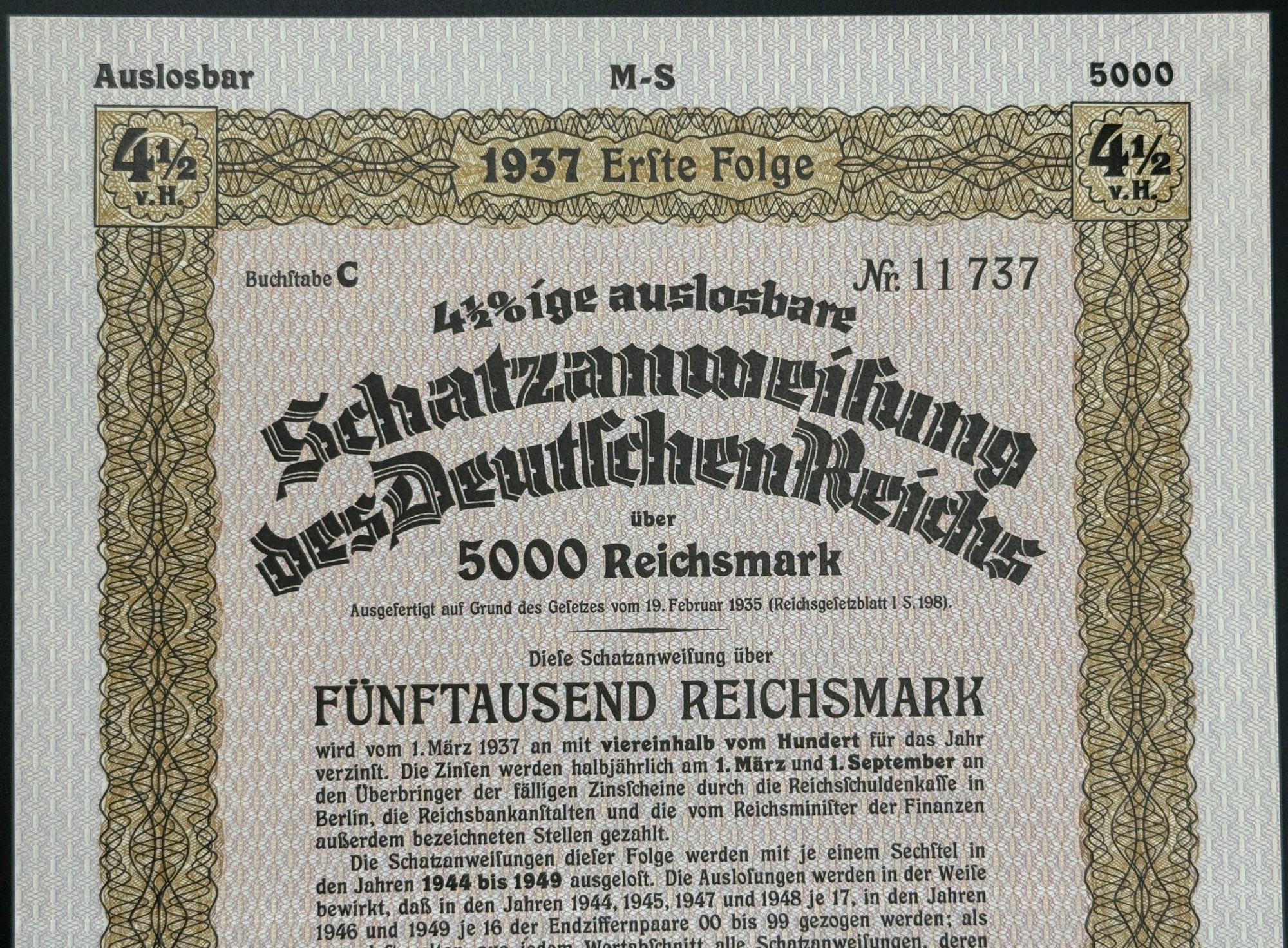 Émise le 14 avril 1937, cette Schatzanweisung des Deutschen Reiches est une obligation d’État allemande d’un montant de 5000 Reichsmark, assortie d’un taux d’intérêt de 4,5 % par an, payable semestriellement. Il s’agit d’un bon de loterie remboursable par tirage au sort, relevant de la première série (Erste Folge), et émis conformément à la loi du 19 février 1935. Imprimé sur papier filigrané, encadré d’un motif décoratif rose, le document porte le sceau rouge de la Reichsschuldenverwaltung, des signatures officielles, ainsi que la croix gammée intégrée au Reichsadler, emblème du régime nazi, utilisée ici comme symbole d’autorité étatique. Le texte dense détaille les modalités de tirage (1944–1949), les règles de présentation des coupons d’intérêt, et les conditions d’extinction des droits après trente ans. Témoignage matériel d’un régime responsable d’atrocités majeures, cette obligation est présentée exclusivement pour sa valeur historique et documentaire, sans aucune forme d’adhésion ou de glorification ; elle doit être étudiée avec discernement, sensibilité éthique, et respect de la mémoire des victimes. Proposé dans une approche muséale, ce document incarne la rigueur scripturale du financement étatique, tout en rappelant la charge mémorielle associée aux instruments économiques du Troisième Reich.