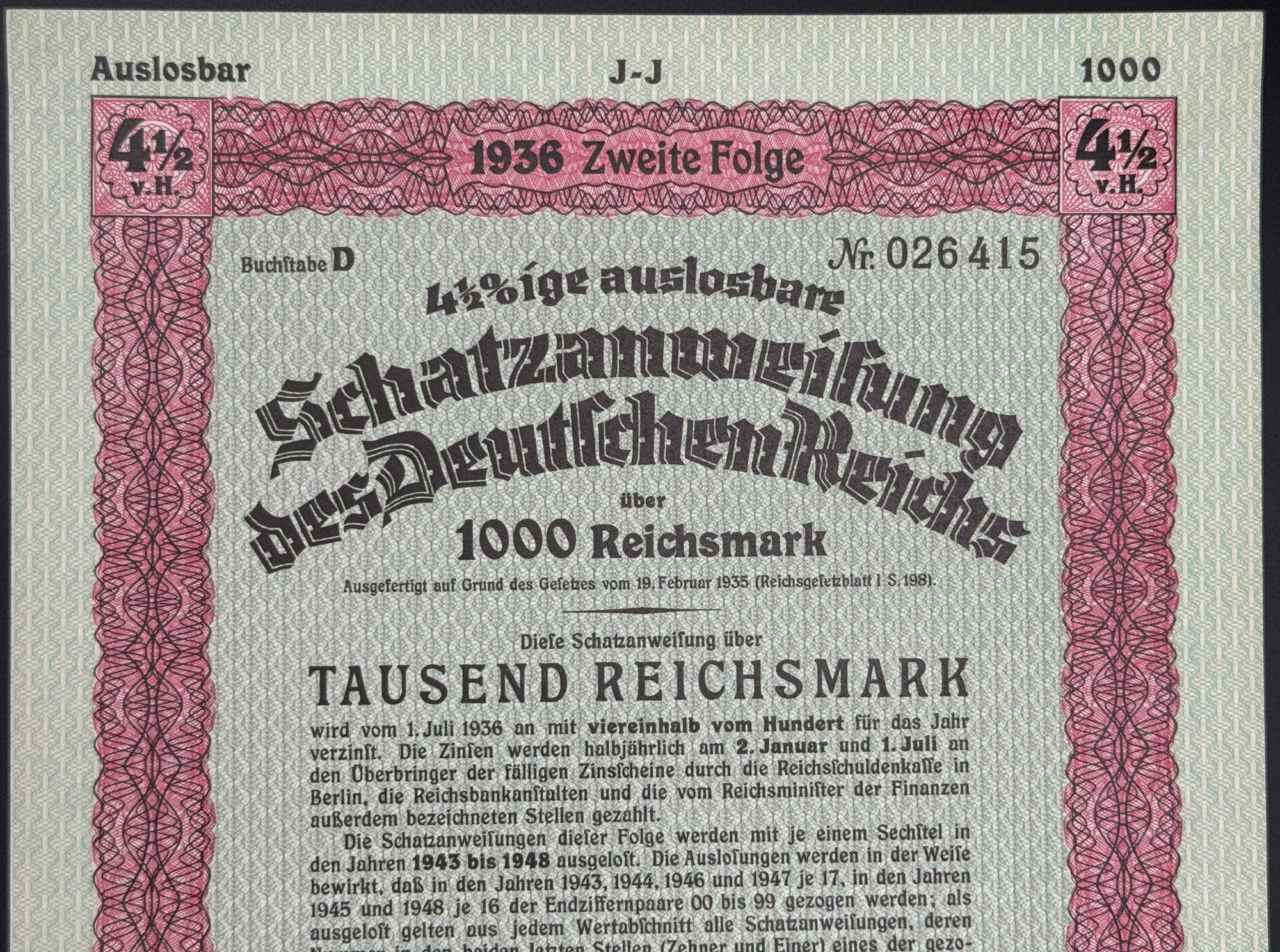 Émise le 3 août 1936, cette Schatzanweisung des Deutschen Reiches est une obligation d’État allemande d’un montant de 1000 Reichsmark, assortie d’un taux d’intérêt de 4,5 % par an, payable semestriellement. Il s’agit d’un bon de loterie remboursable par tirage au sort, relevant de la deuxième série (Zweite Folge), et émis conformément à la loi du 19 février 1935, dans le cadre des politiques économiques du Troisième Reich. Imprimé sur papier filigrané, encadré d’un motif décoratif rouge, le document porte le sceau rouge de la Reichsschuldenverwaltung, des signatures officielles, ainsi que la croix gammée intégrée au Reichsadler, emblème du régime nazi, utilisée ici comme symbole d’autorité étatique. Le texte détaille les modalités de tirage (1943–1948), les règles de présentation des coupons d’intérêt, et les conditions d’extinction des droits après trente ans. Témoignage matériel d’un régime responsable d’atrocités majeures, cette obligation est présentée exclusivement pour sa valeur historique et documentaire, sans aucune forme d’adhésion ou de glorification ; elle doit être étudiée avec discernement, sensibilité éthique, et respect de la mémoire des victimes. Proposé dans une approche muséale, ce document incarne la rigueur scripturale du financement étatique, tout en rappelant la charge mémorielle associée aux instruments économiques du Troisième Reich.