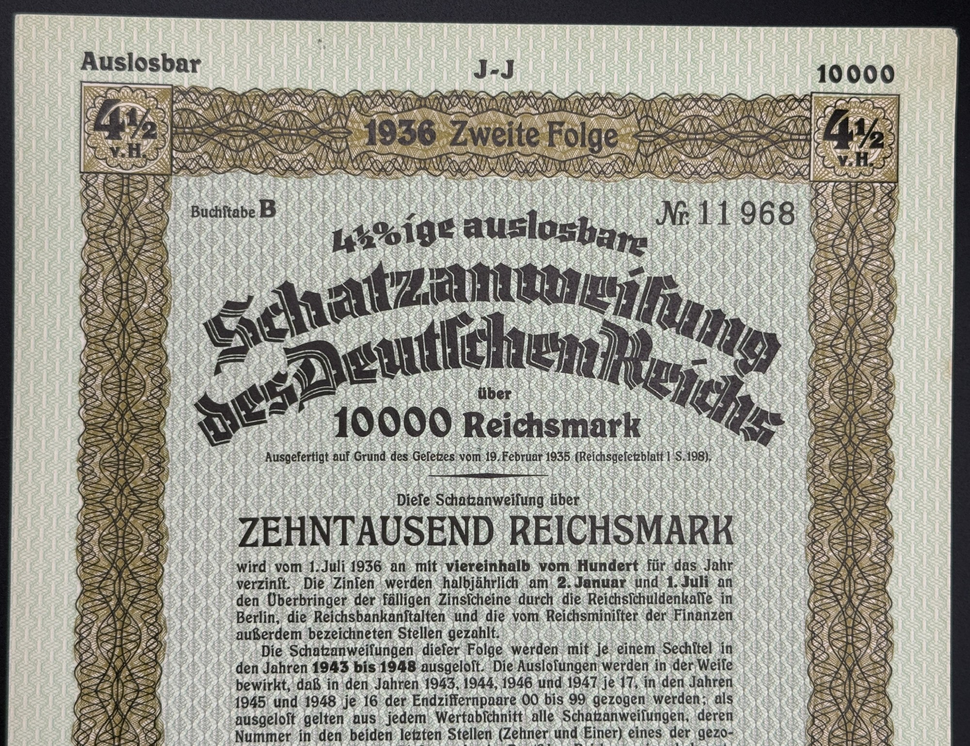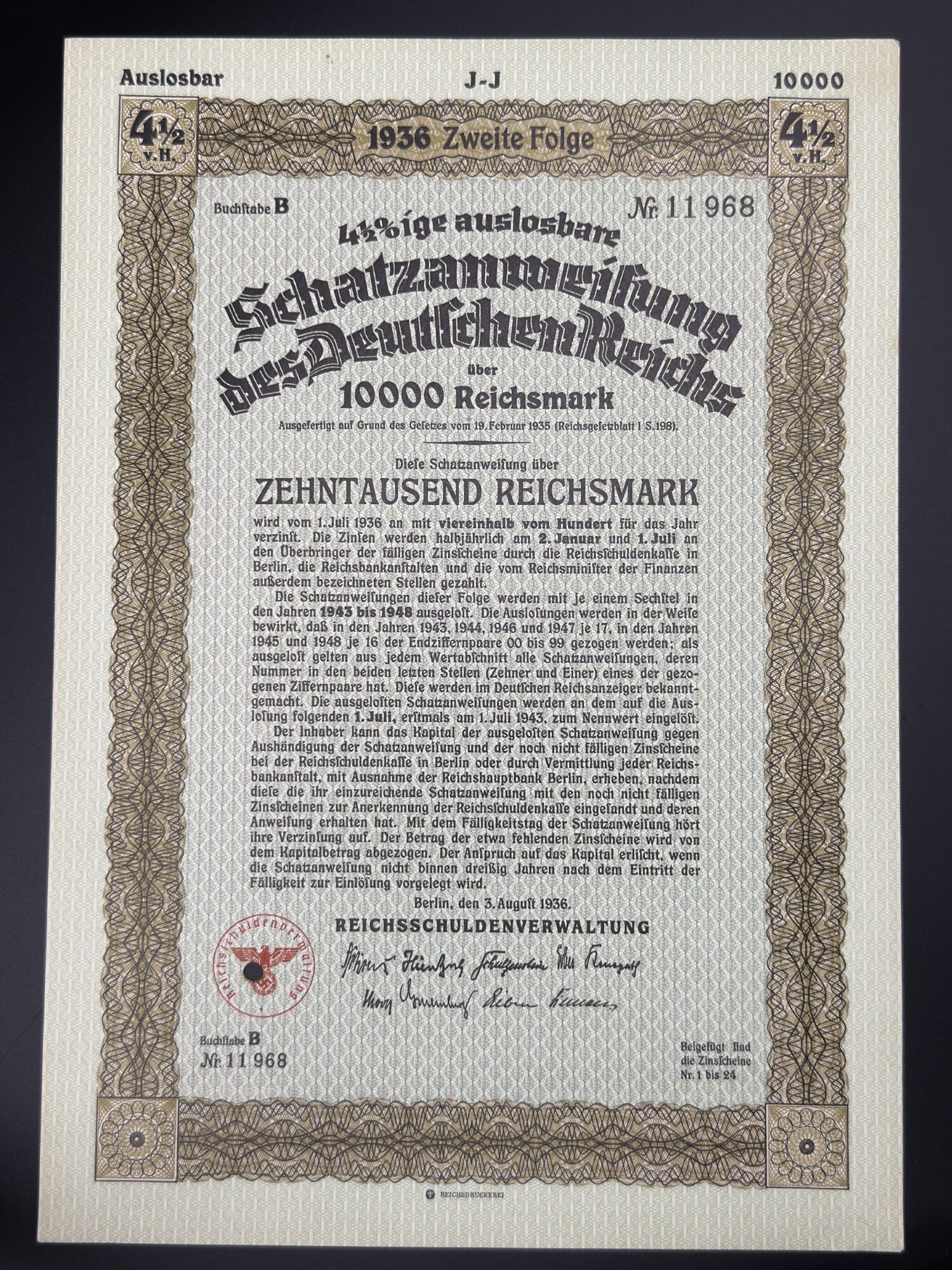 Voici un ensemble exceptionnel de trois obligations consécutives, toutes émises le 3 août 1936 par l’Administration de la Dette du Reich, dans le cadre de la deuxième série du Troisième Reich. Chaque titre représente un engagement de dette de 10 000 Reichsmark, assorti d’un taux d’intérêt de 4,5 % par an, payable annuellement le 1er juillet, avec première échéance en 1937 et maturité finale en 1966. Ces obligations sont remboursables par tirage au sort annuel du 10 juillet 1935, et la Bekanntmachung du 10 juillet 1936. Les trois documents forment une séquence consécutive rarissime, conservée intacte, ce qui en fait un véritable tour de force archivistique. Imprimés sur papier filigrané, ornés de bordures décoratives, et frappés du sceau rouge de 1936, ils arborent la croix gammée, emblème du régime nazi, utilisé ici comme symbole d’autorité étatique et de légitimation financière. Témoignages matériels d’un régime responsable d’atrocités majeures, ces obligations sont présentées exclusivement pour leur valeur historique et documentaire, sans aucune forme d’adhésion ou de glorification ; elles doivent être étudiées avec discernement, sensibilité éthique, et respect de la mémoire des victimes. Proposées dans une approche muséale, elles incarnent la rigueur scripturale du financement étatique, tout en révélant la puissance visuelle et idéologique des instruments économiques du Troisième Reich.