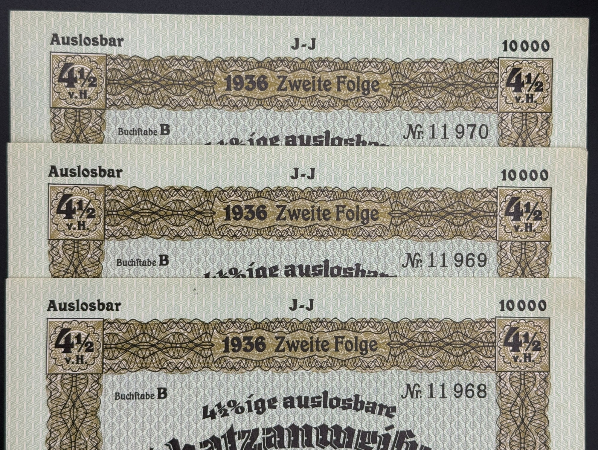 Obligations d’État – Allemagne – 1936 – Série “Zweite Folge” – Séquence Consécutive de Trois Titres – 10 000 Reichsmark – Documents de Financement Structuré