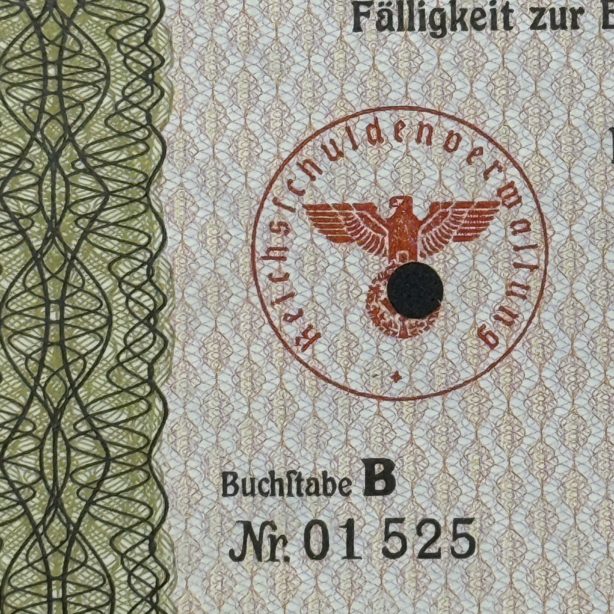 Émise le 14 juillet 1937 par l’Administration de la Dette, ce document représente un engagement de dette de 10 000 Reichsmark, assorti d’un taux d’intérêt de 4,5 % par an, payable annuellement chaque 1er juillet, avec première échéance en 1938. Elle fait partie de la première série des obligations de loterie, remboursables par tirage au sort selon les modalités définies dans les textes officiels du Reich. Le document est imprimé sur papier filigrané et encadré d’un motif décoratif vert. Il est signé, tamponné, et visuellement dominé par le Reichsadler avec croix gammée, emblème du régime nazi, utilisé ici comme symbole d’autorité étatique et de légitimation financière. Témoignage matériel d’un régime responsable d’atrocités majeures, cette obligation est présentée exclusivement pour sa valeur historique et documentaire, sans aucune forme d’adhésion ou de glorification ; elle doit être étudiée avec discernement, sensibilité éthique, et respect de la mémoire des victimes. Proposé dans une approche muséale, ce document incarne la rigueur scripturale du financement étatique, tout en révélant la puissance visuelle et idéologique des instruments économiques du Troisième Reich.