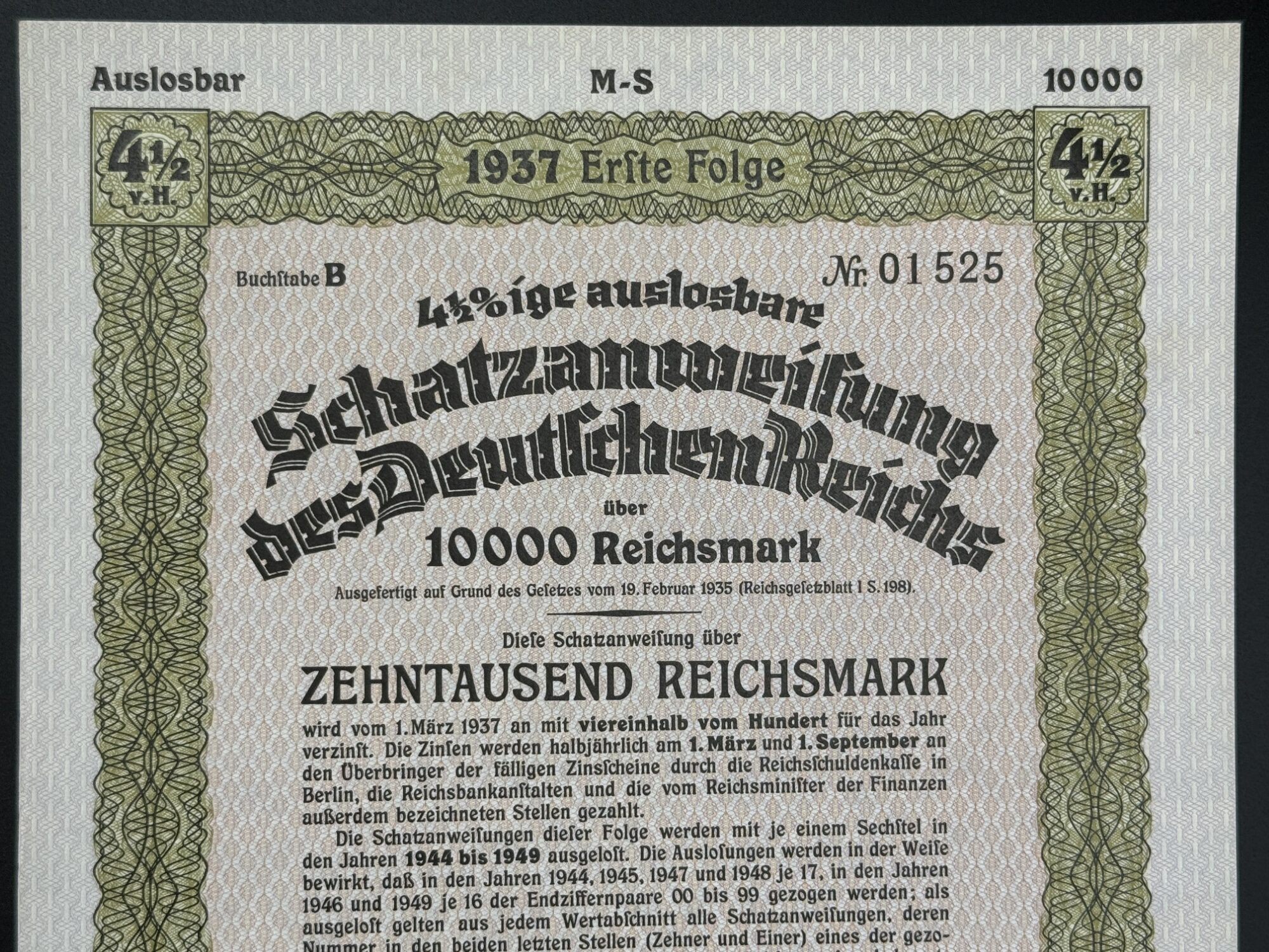 Obligation d’État – Allemagne – 1937 – 10 000 Reichsmark – Série “Erste Folge” – Document de Financement Structuré