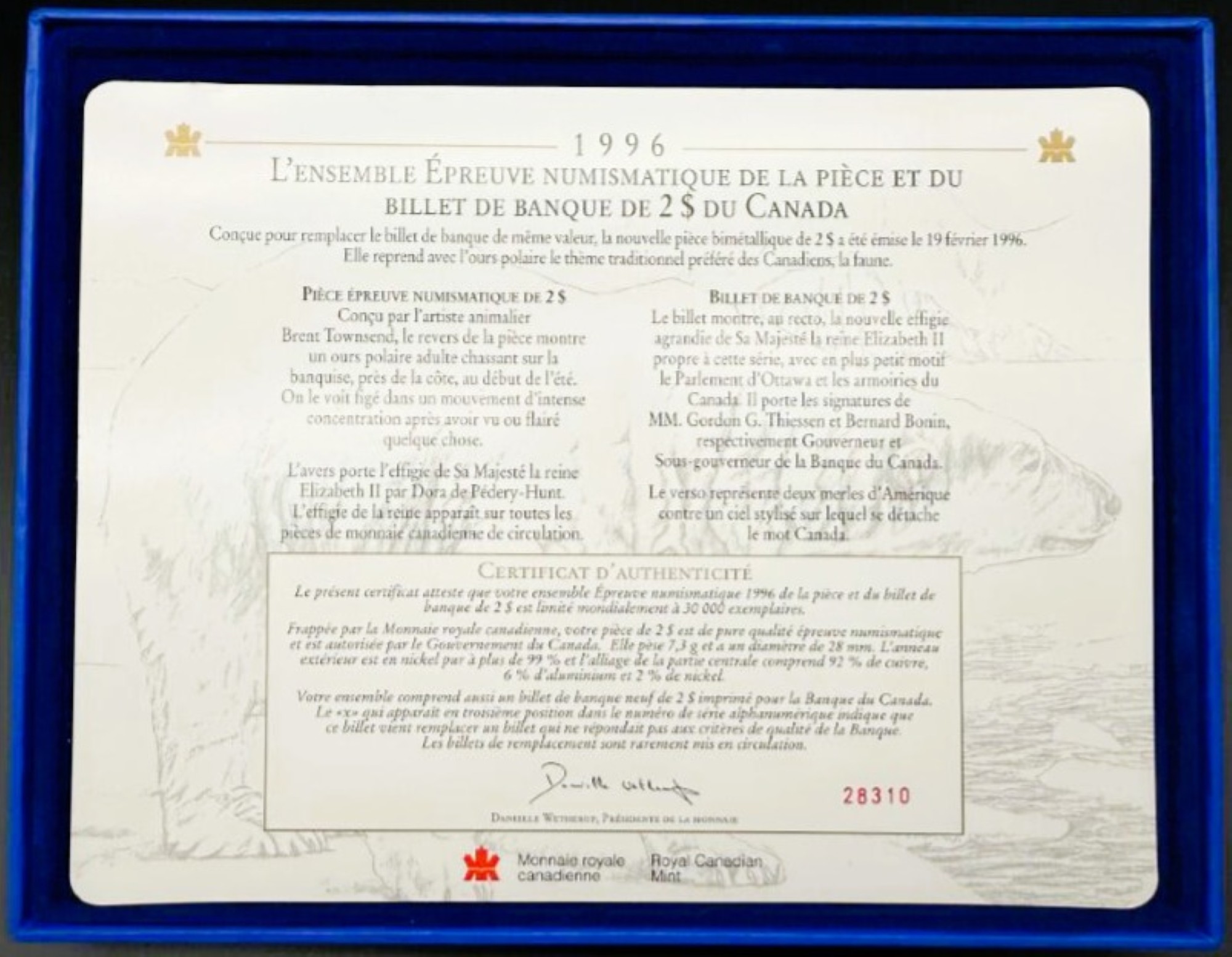 Cet Ensemble Épreuve Numismatique du 2 dollars du Canada émis à seulement 30 000 exemplaires réuni une pièce de 2 dollars frappée en qualité épreuve, et un billet de remplacement UNC soigneusement sélectionné. La pièce, réalisée avec un miroir profond et un givre satiné, offre une présence visuelle raffinée qui magnifie le motif du toonie, tout en conservant les caractéristiques métalliques de la circulation courante. Le billet de remplacement, rare par nature, ajoute une dimension fiduciaire recherchée, particulièrement appréciée des collectionneurs spécialisés. Présenté dans un coffret officiel élégant, l’ensemble met en valeur l’union du métal et du papier‑monnaie dans une composition sobre et prestigieuse. Cette édition est aujourd’hui très recherchée, tant pour son tirage limité que pour la combinaison singulière d’une frappe épreuve en métal classique et d’un billet de remplacement UNC, faisant de cet ensemble une pièce distinctive au sein de la numismatique canadienne moderne.