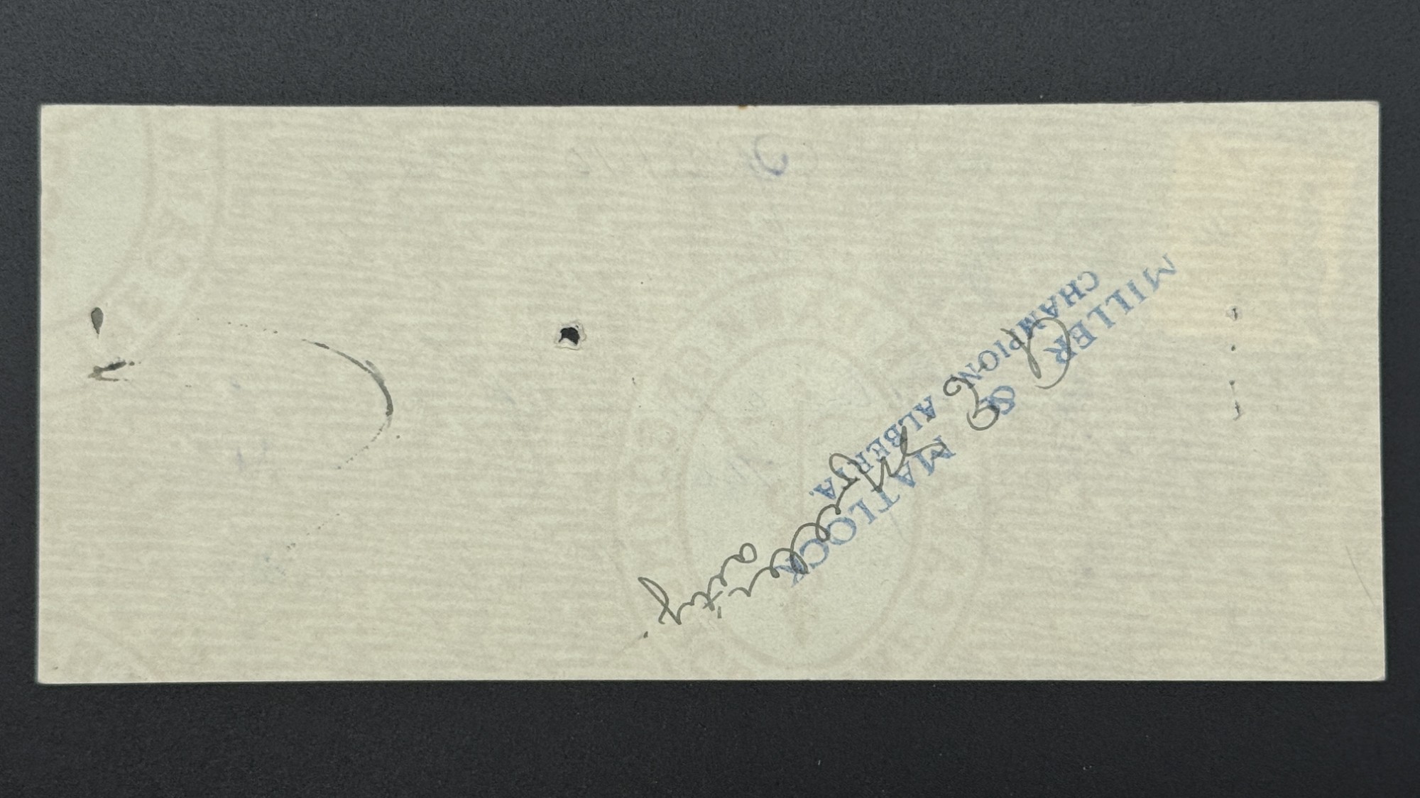 Ce chèque utilisé, émis par The Canadian Bank of Commerce à Champion, Alberta, est une pièce scripturale vivante, témoin d’une époque où la correspondance bancaire se passait souvent sans enveloppe, et où les timbres fiscaux, ici un Canada de 3 cents, étaient collés directement sur le chèque, devenant à la fois sceau d’authenticité et trace d’acheminement. Le document est enrichi d’un cachet octogonal violet, daté et estampillé, qui marque son passage en caisse avec une rigueur presque cérémonielle. L’écriture manuscrite, fluide et légèrement néo-gothique, danse entre les encadrés typographiques, tandis que la ligne d’annulation traverse le chèque comme une cicatrice administrative, preuve de son usage réel. Chaque élément ; le papier, l’encre, le timbre ou le sceau compose une chorégraphie visuelle et historique, où la monnaie scripturale devient objet patrimonial, porteur de gestes, de confiance et de mémoire. Proposé dans une approche muséale, ce chèque circulé incarne la beauté silencieuse des documents ayant traversé le temps, et révèle l’élégance discrète des pratiques bancaires du Canada rural des années 1950.