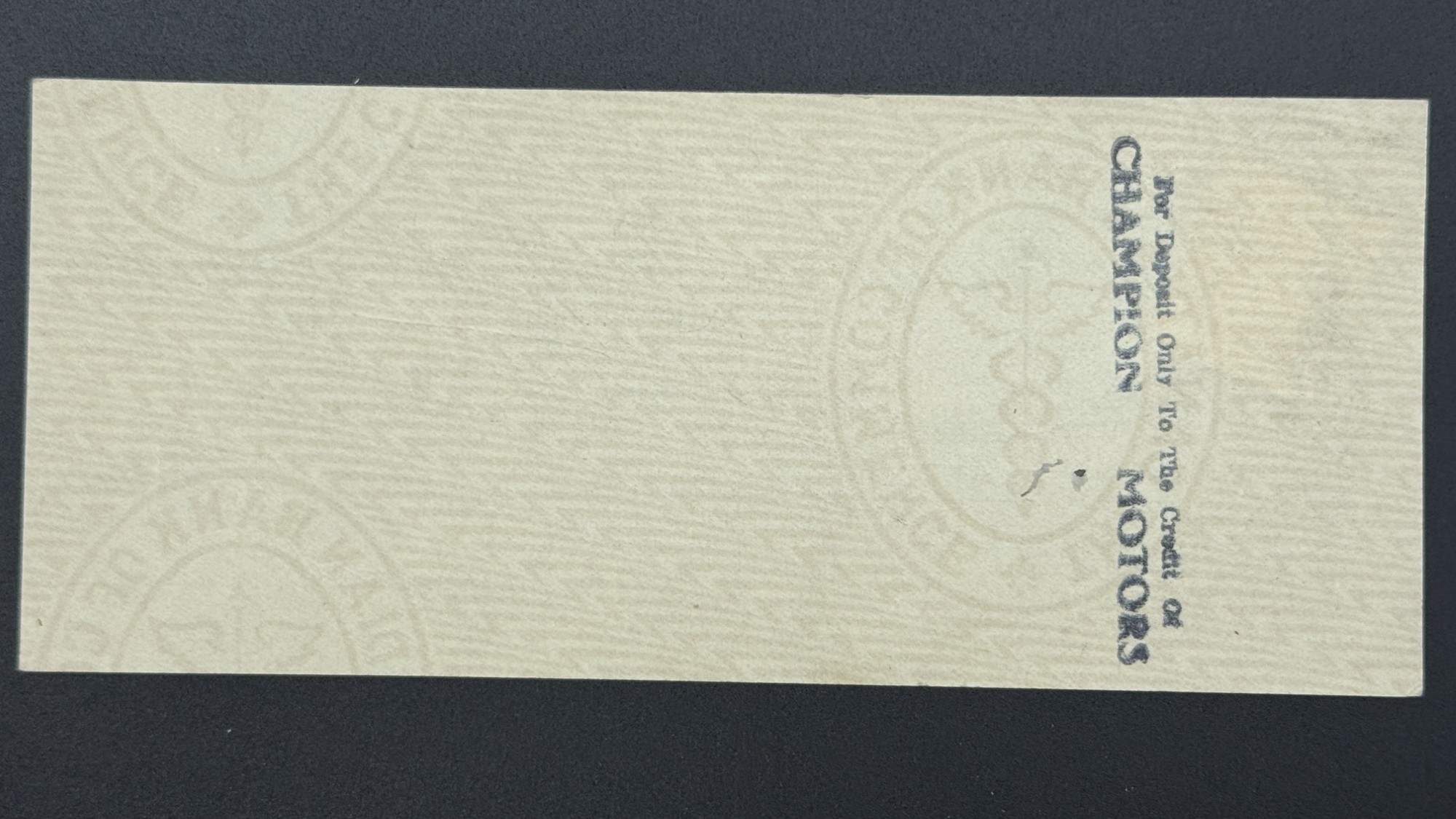 Ce chèque utilisé, émis par The Canadian Bank of Commerce à Champion, Alberta, est une pièce scripturale vivante, témoin d’une époque où la correspondance bancaire se passait souvent sans enveloppe, et où les timbres fiscaux, ici un Canada de 3 cents, étaient collés directement sur le chèque, devenant à la fois sceau d’authenticité et trace d’acheminement. Le document est enrichi d’un cachet octogonal violet, daté et estampillé, qui marque son passage en caisse avec une rigueur presque cérémonielle. L’écriture manuscrite, fluide et légèrement néo-gothique, danse entre les encadrés typographiques, tandis que la ligne d’annulation traverse le chèque comme une cicatrice administrative, preuve de son usage réel. Chaque élément ; le papier, l’encre, le timbre ou le sceau compose une chorégraphie visuelle et historique, où la monnaie scripturale devient objet patrimonial, porteur de gestes, de confiance et de mémoire. Proposé dans une approche muséale, ce chèque circulé incarne la beauté silencieuse des documents ayant traversé le temps, et révèle l’élégance discrète des pratiques bancaires du Canada rural des années 1940.