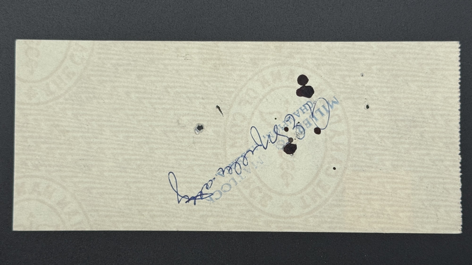 Ce chèque utilisé, émis par The Canadian Bank of Commerce à Champion, Alberta, est une pièce scripturale vivante, témoin d’une époque où la correspondance bancaire se passait souvent sans enveloppe, et où les timbres fiscaux, ici un Canada de 3 cents, étaient collés directement sur le chèque, devenant à la fois sceau d’authenticité et trace d’acheminement. Le document est enrichi d’un cachet octogonal violet, daté et estampillé, qui marque son passage en caisse avec une rigueur presque cérémonielle. L’écriture manuscrite, fluide et légèrement néo-gothique, danse entre les encadrés typographiques, tandis que la ligne d’annulation traverse le chèque comme une cicatrice administrative, preuve de son usage réel. Chaque élément ; le papier, l’encre, le timbre ou le sceau compose une chorégraphie visuelle et historique, où la monnaie scripturale devient objet patrimonial, porteur de gestes, de confiance et de mémoire. Proposé dans une approche muséale, ce chèque circulé incarne la beauté silencieuse des documents ayant traversé le temps, et révèle l’élégance discrète des pratiques bancaires du Canada rural des années 1950.