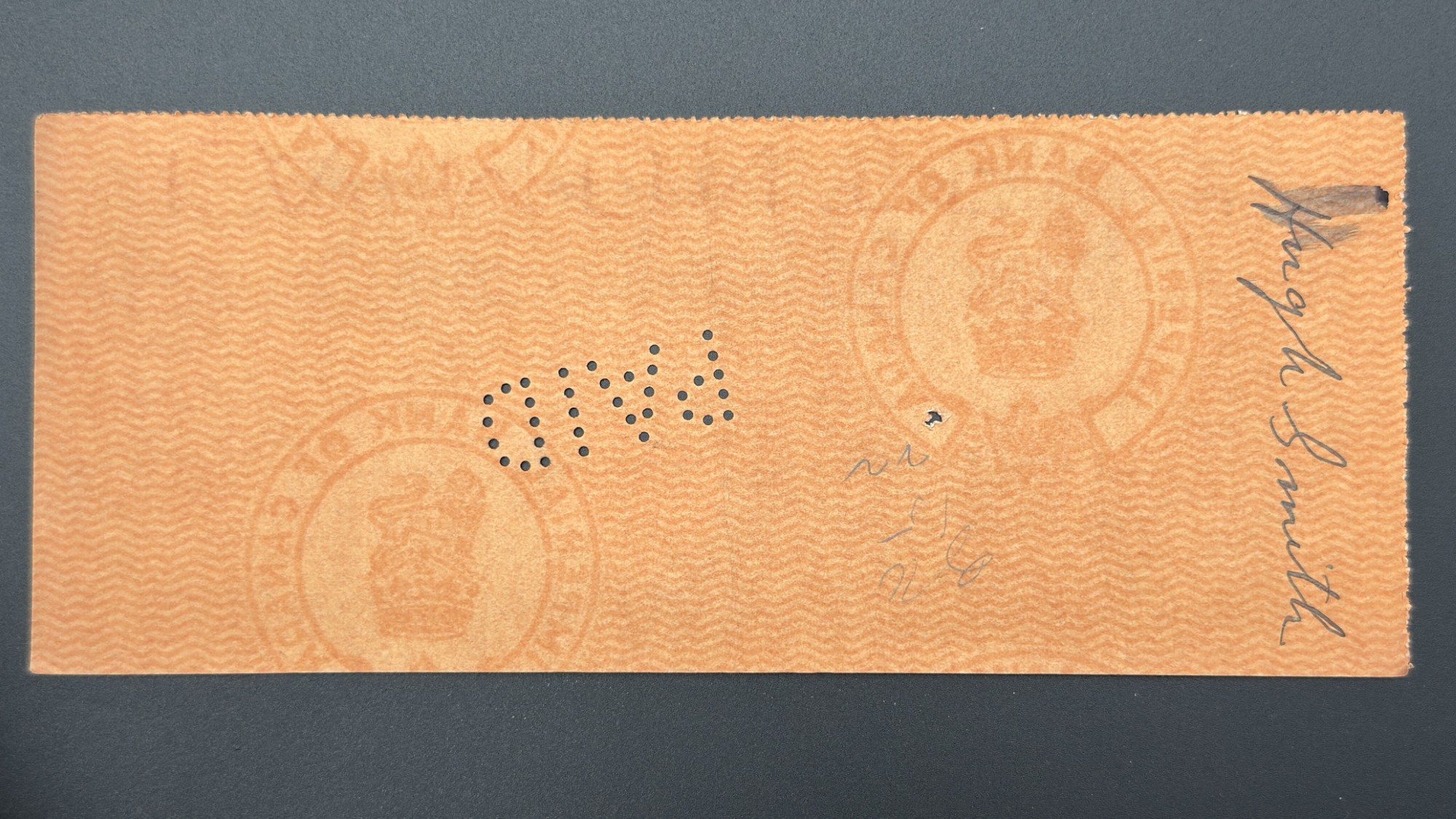 Ce chèque circulé de la Imperial Bank of Commerce, émis à St. Catharines, Ontario, datant du début du XX siècle, se distingue par son format généreux, sa teinte orange vibrante, et son raffinement typographique, où l’écriture manuscrite s’élève en cursive néo-gothique, entre encadrés imprimés et lettrages institutionnels. Collé directement sur le chèque, un timbre fiscal canadien de 2 cents témoigne d’une époque où les enveloppes étaient souvent omises, et où le timbre devenait sceau d’authenticité, preuve d’acheminement ou de validation. Mais c’est aussi au verso que s’exprime toute la splendeur graphique : une chorégraphie d’étampes multicolores, hexagonales, circulaires, datées, numérotées, qui racontent le passage du document à travers les mains des guichetiers, des caissiers, des vérificateurs. Chaque perforation, chaque signature, chaque tampon est une trace vivante, un fragment de geste économique devenu objet patrimonial. Proposé dans une approche muséale, ce chèque incarne la beauté silencieuse des documents ayant réellement circulé, et révèle l’élégance discrète des pratiques bancaires canadiennes du début du XXe siècle.