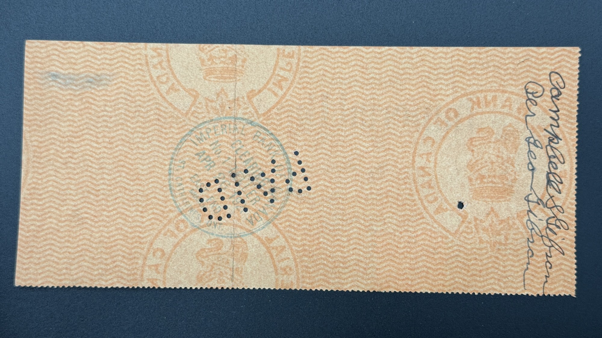 Ce chèque circulé de la Imperial Bank of Commerce, émis à St. Catharines, Ontario, datant du début du XX siècle, se distingue par son format généreux, sa teinte orange vibrante, et son raffinement typographique, où l’écriture manuscrite s’élève en cursive néo-gothique, entre encadrés imprimés et lettrages institutionnels. Collé directement sur le chèque, un timbre fiscal canadien de 2 cents témoigne d’une époque où les enveloppes étaient souvent omises, et où le timbre devenait sceau d’authenticité, preuve d’acheminement ou de validation. Mais c’est aussi au verso que s’exprime toute la splendeur graphique : une chorégraphie d’étampes multicolores, hexagonales, circulaires, datées, numérotées, qui racontent le passage du document à travers les mains des guichetiers, des caissiers, des vérificateurs. Chaque perforation, chaque signature, chaque tampon est une trace vivante, un fragment de geste économique devenu objet patrimonial. Proposé dans une approche muséale, ce chèque incarne la beauté silencieuse des documents ayant réellement circulé, et révèle l’élégance discrète des pratiques bancaires canadiennes du début du XXe siècle.
