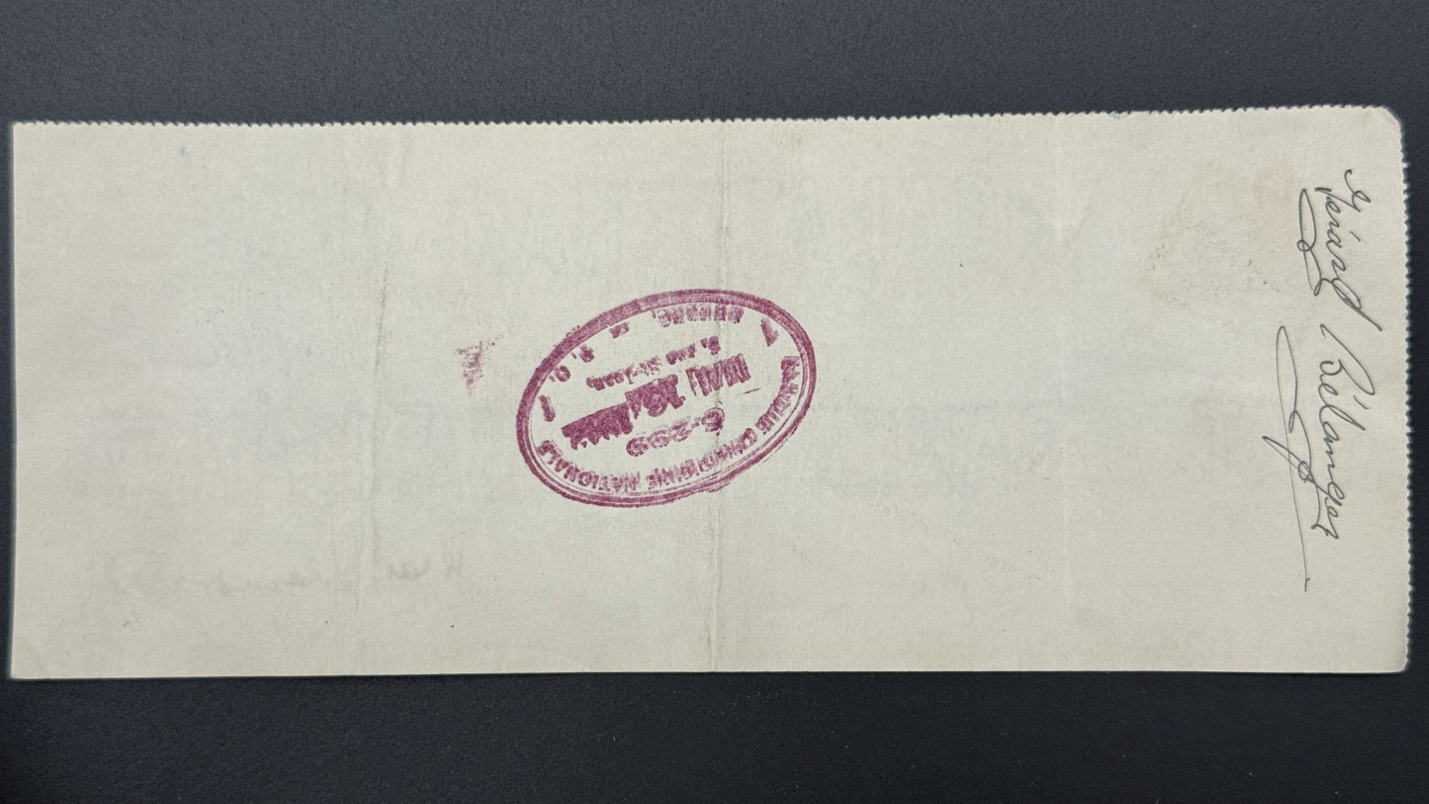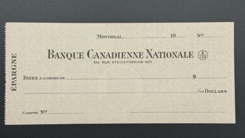 Ce chèque circulé de la Banque Canadienne Nationale, émis à Québec en 1942, est une pièce scripturale d’une élégance discrète, où chaque élément visuel raconte un fragment de l’histoire bancaire francophone. Imprimé sur papier à motifs de sécurité, il est enrichi d’un timbre fiscal canadien de 3 cents, collé directement sur le chèque, pratique courante à l’époque, où l’enveloppe était souvent omise, et le timbre devenait sceau d’authenticité et de validation postale. L’écriture manuscrite, fluide et légèrement néo-gothique, s’inscrit entre les encadrés typographiques, tandis que la ligne d’annulation traverse le document comme une trace vivante de son passage en caisse. Le sceau, les encres, les perforations et les signatures forment une chorégraphie visuelle, où la monnaie scripturale deviennent objet patrimonial, porteur de gestes, de confiance et de mémoire. Proposé dans une approche muséale, ce chèque incarne la beauté silencieuse des documents ayant réellement circulé, et révèle l’élégance des pratiques bancaires québécoises du milieu du XXe siècle.