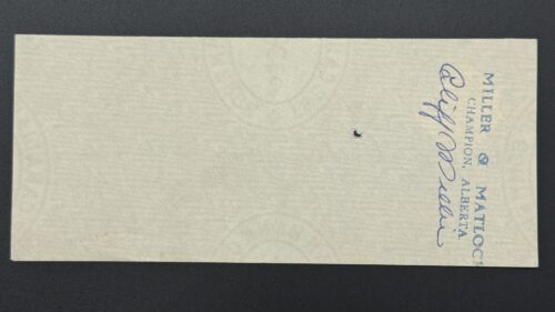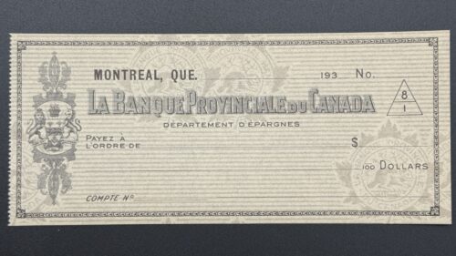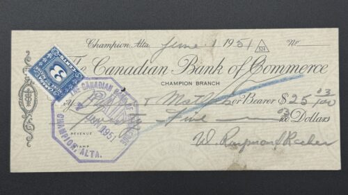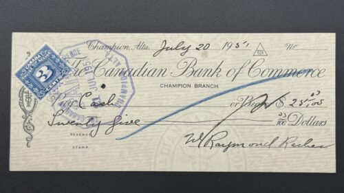 Ce chèque circulé de la Banque Canadienne Nationale, émis à Québec en 1942, est une pièce scripturale d’une élégance discrète, où chaque élément visuel raconte un fragment de l’histoire bancaire francophone. Imprimé sur papier à motifs de sécurité, il est enrichi d’un timbre fiscal canadien de 3 cents, collé directement sur le chèque, pratique courante à l’époque, où l’enveloppe était souvent omise, et le timbre devenait sceau d’authenticité et de validation postale. L’écriture manuscrite, fluide et légèrement néo-gothique, s’inscrit entre les encadrés typographiques, tandis que la ligne d’annulation traverse le document comme une trace vivante de son passage en caisse. Le sceau, les encres, les perforations et les signatures forment une chorégraphie visuelle, où la monnaie scripturale deviennent objet patrimonial, porteur de gestes, de confiance et de mémoire. Proposé dans une approche muséale, ce chèque incarne la beauté silencieuse des documents ayant réellement circulé, et révèle l’élégance des pratiques bancaires québécoises du milieu du XXe siècle.