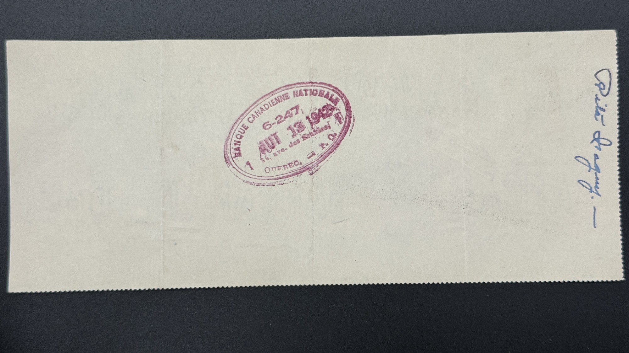 Chèque Circulé – Banque Canadienne Nationale – Document Scriptural de 1942