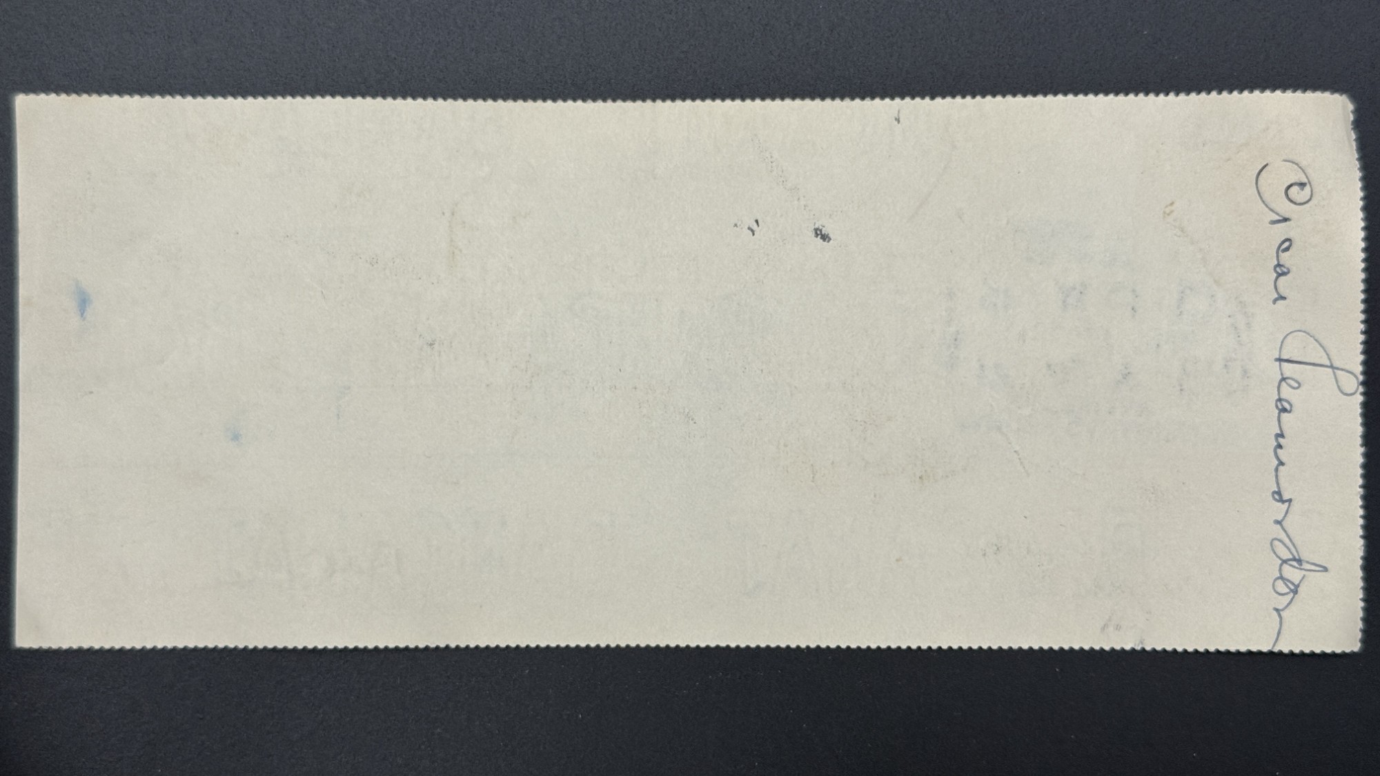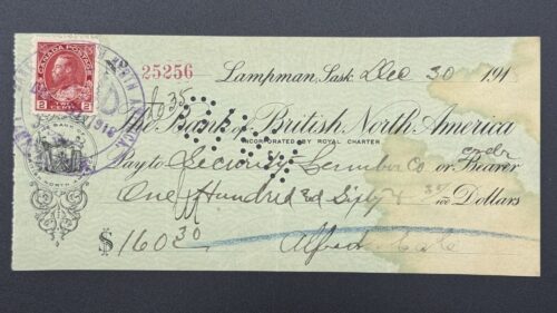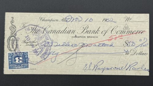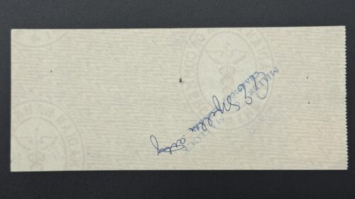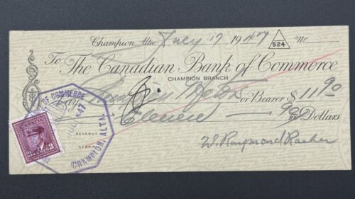 Ce chèque circulé de la Banque Canadienne Nationale, émis à Québec en 1942, est une pièce scripturale d’une élégance discrète, où chaque élément visuel raconte un fragment de l’histoire bancaire francophone. Imprimé sur papier à motifs de sécurité, il est enrichi d’un timbre fiscal canadien de 3 cents, collé directement sur le chèque, pratique courante à l’époque, où l’enveloppe était souvent omise, et le timbre devenait sceau d’authenticité et de validation postale. L’écriture manuscrite, fluide et légèrement néo-gothique, s’inscrit entre les encadrés typographiques, tandis que la ligne d’annulation traverse le document comme une trace vivante de son passage en caisse. Le sceau, les encres, les perforations et les signatures forment une chorégraphie visuelle, où la monnaie scripturale deviennent objet patrimonial, porteur de gestes, de confiance et de mémoire. Proposé dans une approche muséale, ce chèque incarne la beauté silencieuse des documents ayant réellement circulé, et révèle l’élégance des pratiques bancaires québécoises du milieu du XXe siècle.