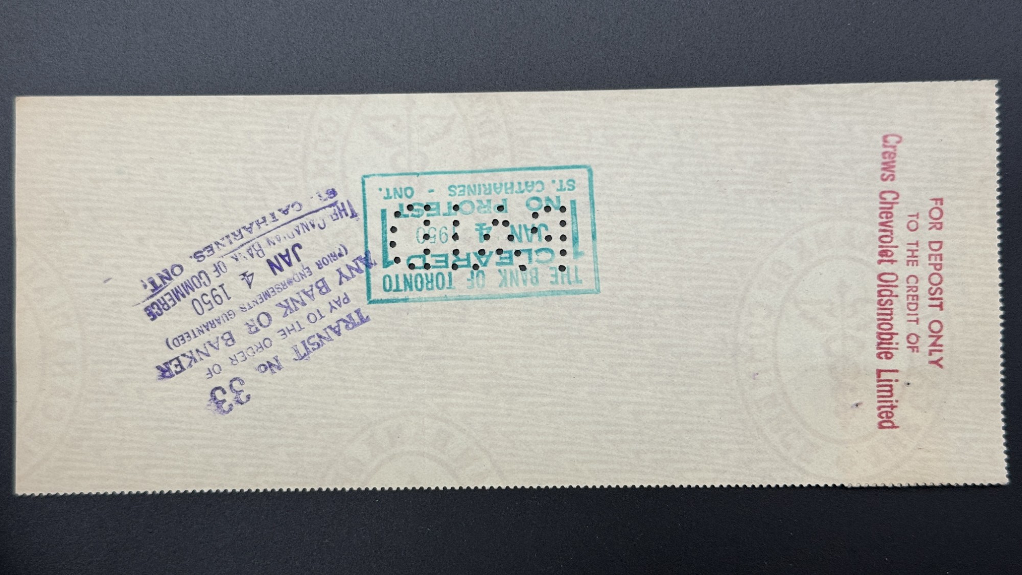Ce chèque circulé de The Canadian Bank of Commerce, émis dans la première moitié du XXe siècle, se distingue par son format généreux, sa présence typographique affirmée, et son raffinement visuel, où l’écriture manuscrite s’élève en cursive néo-gothique, entre encadrés imprimés et lettrages institutionnels. Collé directement sur le chèque, un timbre fiscal canadien souvent de 2 cents témoigne d’une époque où les enveloppes étaient souvent omises, et où le timbre devenait sceau d’authenticité, preuve d’acheminement ou de validation. Le document est enrichi de tampons bancaires, de perforations mécaniques, et parfois de sceaux multiformes, hexagonaux, circulaires, datés, qui racontent le passage du chèque à travers les mains des caissiers, des vérificateurs, des guichetiers. Chaque élément ; le papier texturé, l’encre, le timbre, ou le sceau compose une chorégraphie visuelle et historique, où la monnaie scripturale devient objet patrimonial, porteur de gestes, de confiance et de mémoire. Proposé dans une approche muséale, ce chèque incarne la beauté silencieuse des documents ayant réellement circulé, et révèle l’élégance discrète des pratiques bancaires canadiennes du début du XXe siècle.